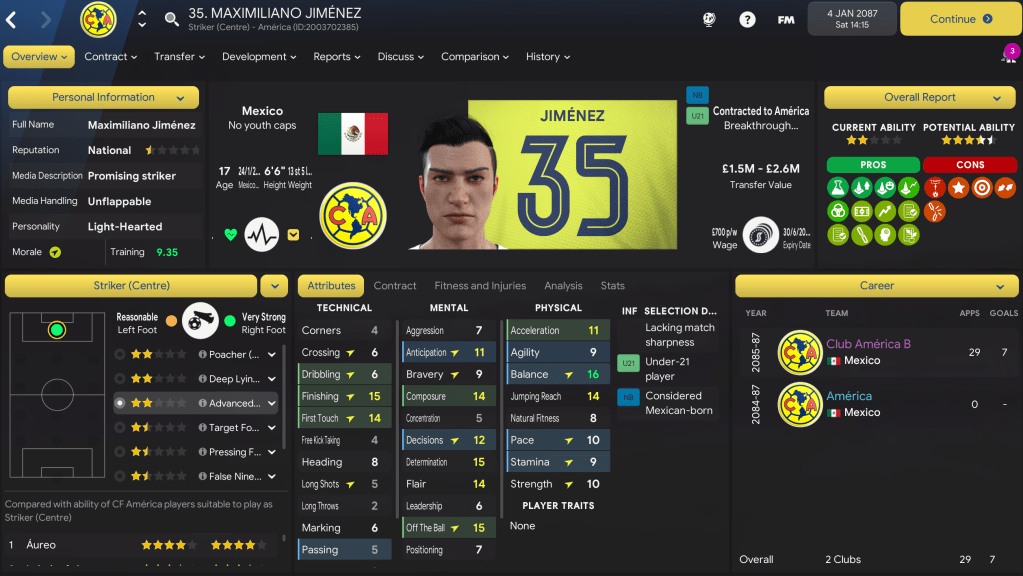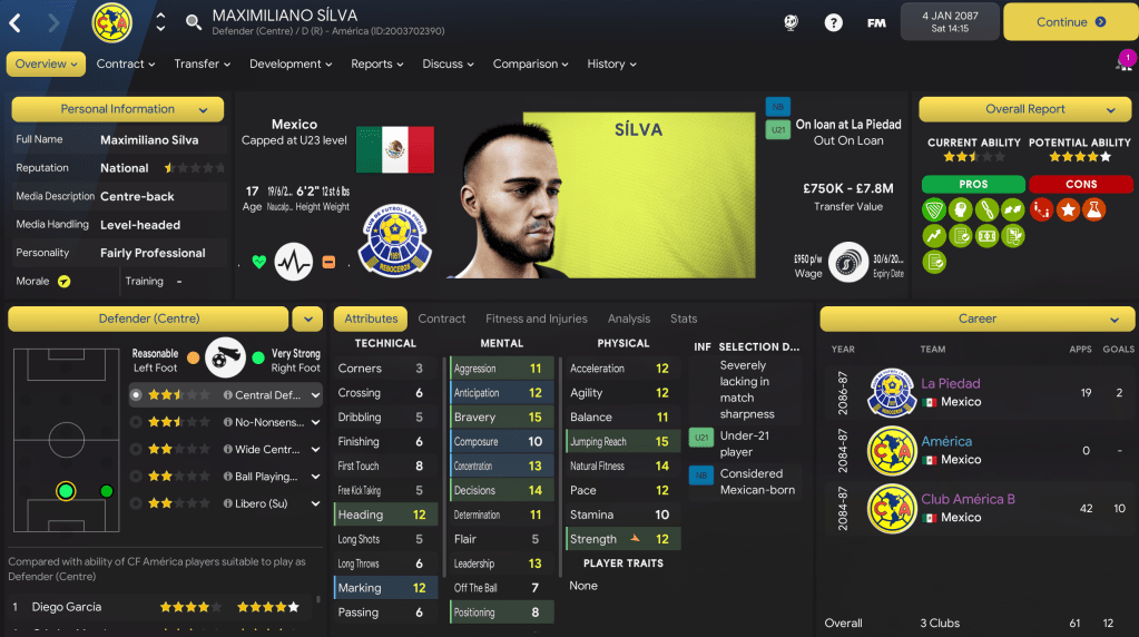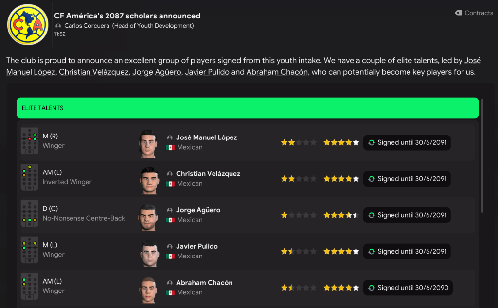 The big positive about América was the prodigious youth development with 13 academy products in the first team and several more in the youth sides. That was added to by a stellar youth intake with four players with 5-star potential and four with 4-star potential. So Lazaró decided to make the final leg of a career founded on developing youth as much of a homegrown player challenge as possible. That began with dishing out new contracts to his best prospects, ready for another season in Mexico.