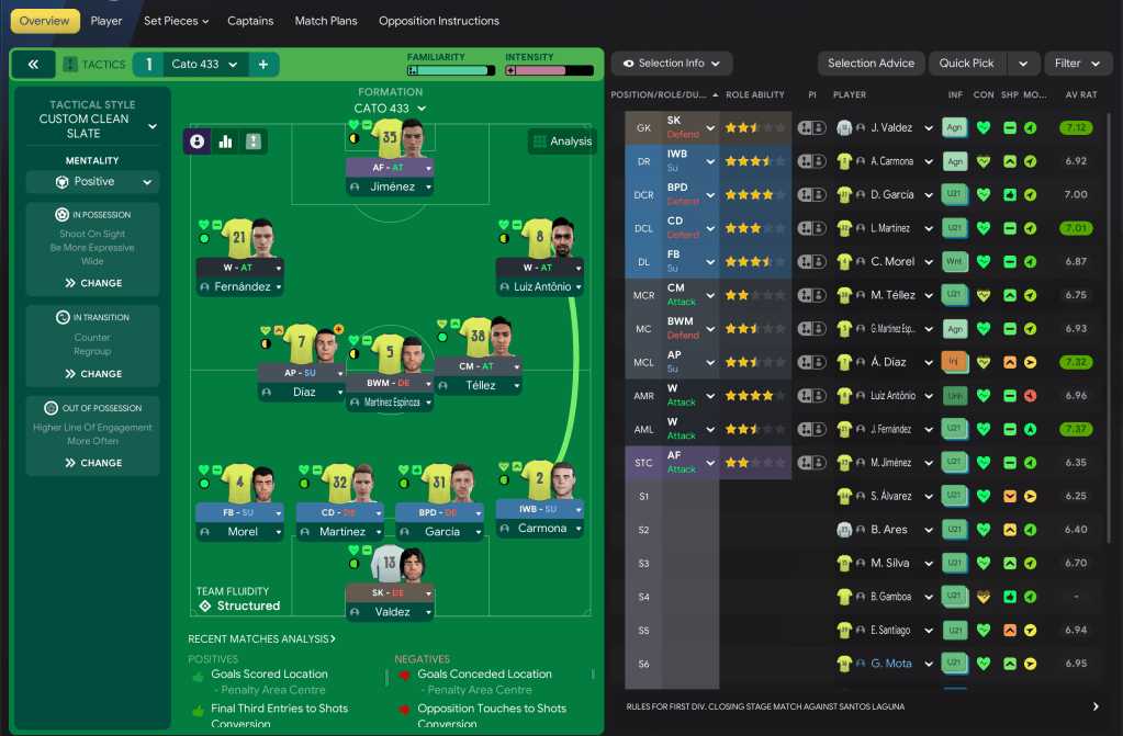 In their place came no signings but even more academy products, which now means only the goalkeepers aren’t academy graduates, the oldest outfield player is Díaz (20) and only three first-team players don’t have 4.5- or 5-star potential! Lazaró also had a tactical rethink to a 5-3-2 to shoehorn in his star centre-backs, play two strikers and address a lack of right-wingers, which required plenty of players to learn new positions but he was keen to trial it.