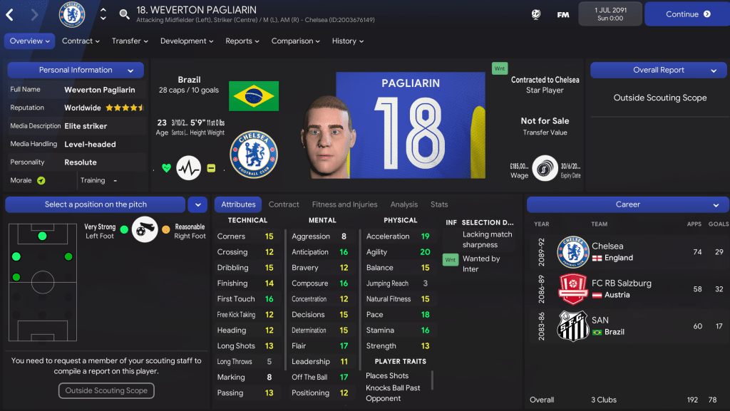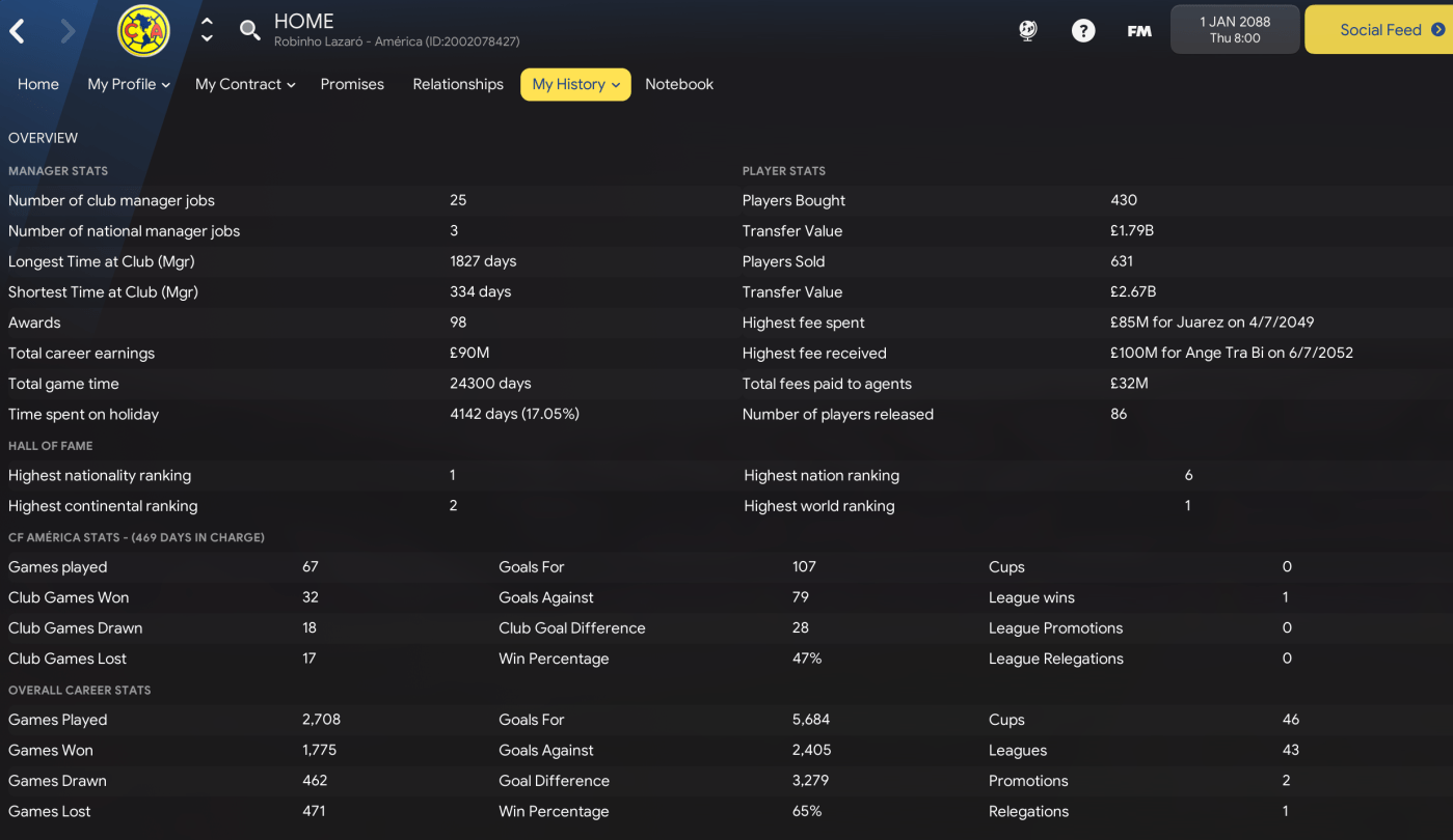 Now at the ripe old age of 108, Lazaró was very much alive and kicking every ball as he watched coverage of the 27 clubs he managed during his illustrious career. Lazaró not only completed his mission to go from a badgeless wannabe to finding an actual job as a Football Manager, he also went on to win every top-tier title in North and South America. He also headed to Europe and enjoyed ridiculous success, then returned to the Américas for even more – managing well into his 11th decade of life.
