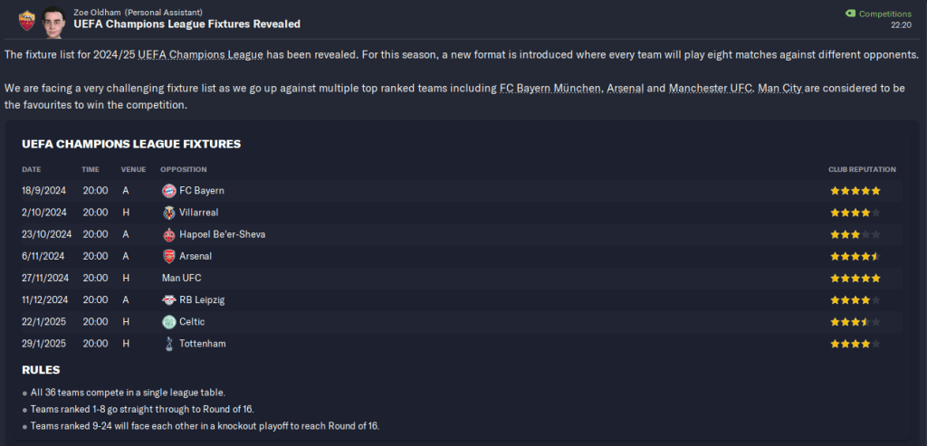 The Champions League format switches to a strange new league format from the 2024/25 campaign. If you’re unaware, 36 teams compete in a league table, each playing eight games against a selection of the other 35 between September and the end of January. The top eight proceed to the last 16 and the next 16 go into playoff games with the eight winners also progressing. We got what my PA judged to be a tough draw, but it’s honestly hard to know. At least we still don’t have to play Erling Haaland.