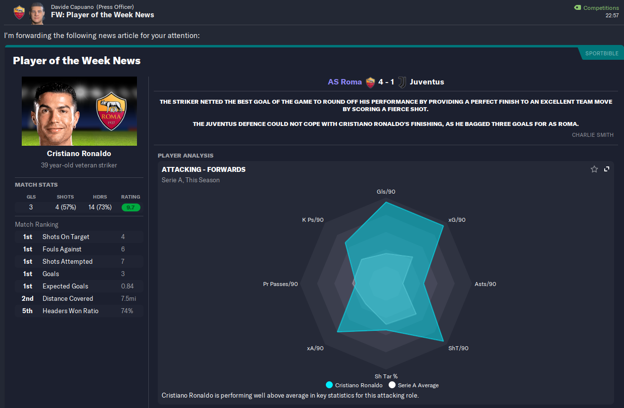 A week later, we welcomed Juventus to town and hammered them with 14 shots to two in the first half, and made one count through that man Ronaldo against his former club. Roger Ibanez headed home a second before Ronaldo was the star man, terrorising Juve’s defence and wrapping up a hat-trick. And to remind you, he’s 39!!