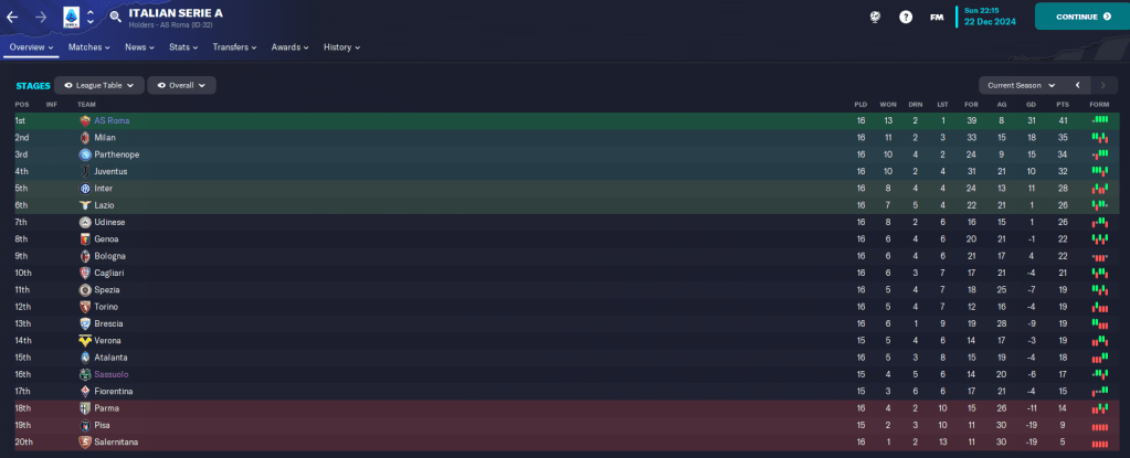 We concluded 2024 by hammering 10-man Spezia 5-0 with Abraham and midfielder Alberto Moleiro both bagging braces. At the same time, Milan lost 2-1 at Juve, which took us into a two-week break with a six-point lead at the top of Serie A. Both Abraham and Ronaldo have 11 league goals, with the latter only starting three and making 12 sub appearances, but they trail the league’s top scorer Lautaro Martínez (14). Abraham and Ronaldo also have the league’s best average ratings of 7.58 and 7.53, while Bardghji and Borella lead the assists chart with nine and six.