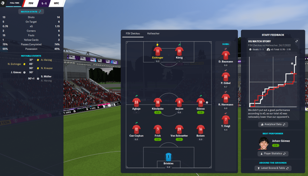 Prusseit’s first game in football was a massive one as Zwickau welcomed fellow East German side Hallescher for an opening day Ost Derby. Another terrible game seemed to be heading for a dull 0-0. But Gómez came off the bench to bag what looked like being a winner, but Hallescher went down the other end to equalise from the kick-off. Annoying, but deserved.