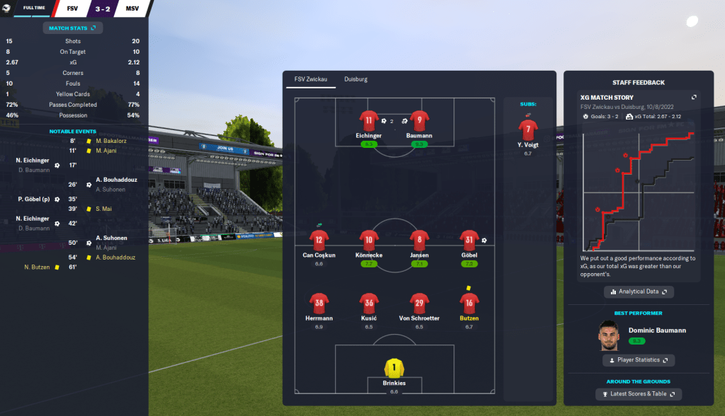 His first away game took him to Meppen, whose winger scored an absolute worldie at the start of each half while Zwickau’s strikers couldn’t score simple chances from six yards out. So they lost 2-0. Next up was one of the league favourites Duisburg and Zwickau made a great start as Eichinger scored his first goal for the club. Duisburg levelled from a corner but Göbel smashed home a penalty before Eichinger swiftly volleyed home his second. Dodgy keeper Brinkies gifted a second just after half-time and Prusseit was worried. And he was right to be as two more long-range strikes came close to equalisers. But his team just about held on for his first-ever win as a Football Manager!