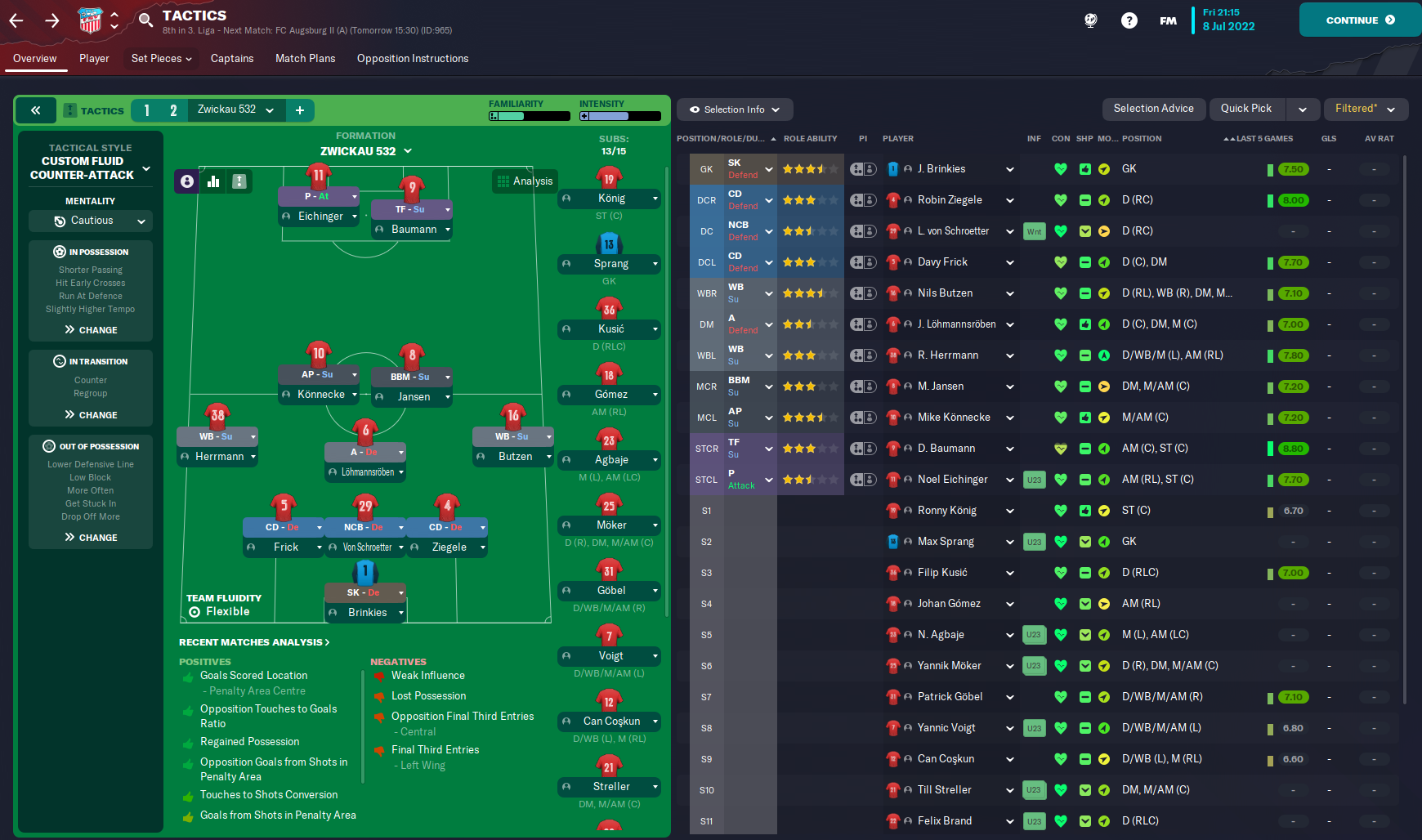 Prusseit slightly tweaked the tactic, moving Jansen back a notch to play as a Regista. He first trialled it on “fan day” as Zwickay welcomed SpVgg Bayreuth to town. They started slowly as Herrmann gifted Bayreuth a goal. But they got level through a Göbel penalty, before Gómez again turned the game as he created a goal for Eichinger then scored a 30-yard screamer to seal a very much undeserved 3-1 victory. However, they lost Baumann for six weeks with sprained knee ligaments.