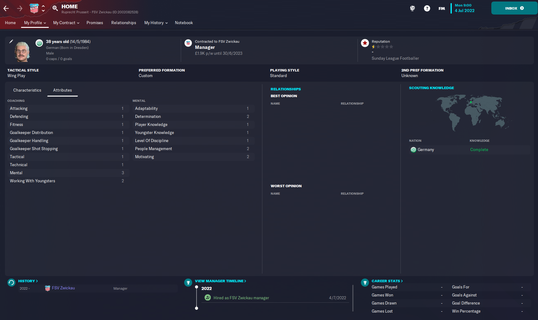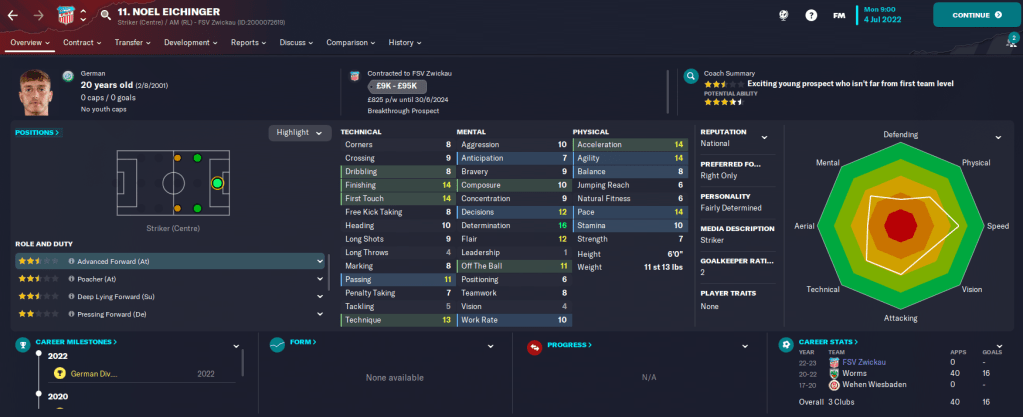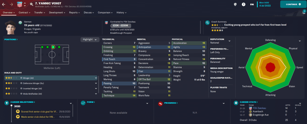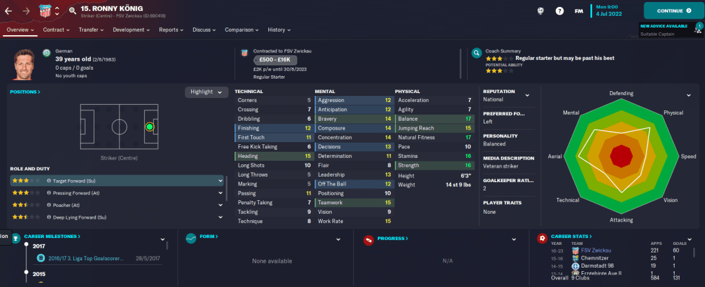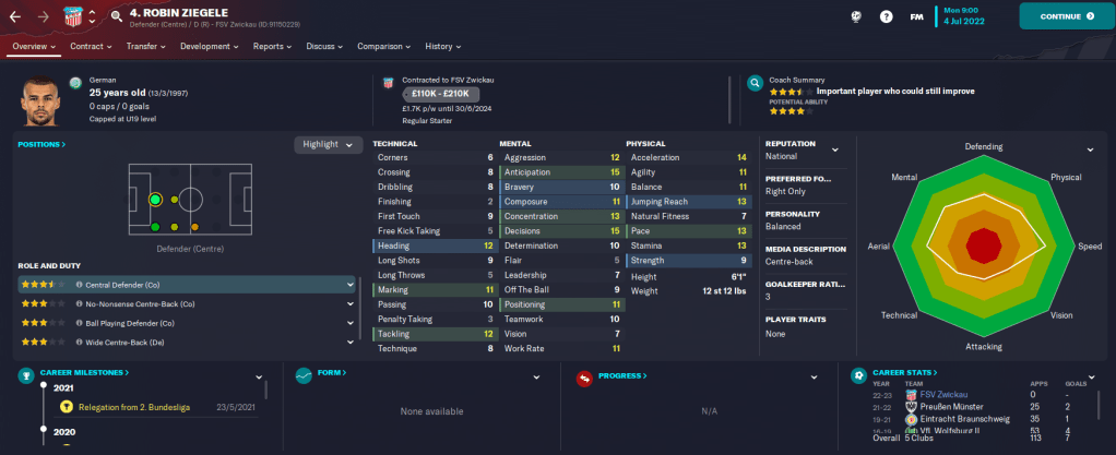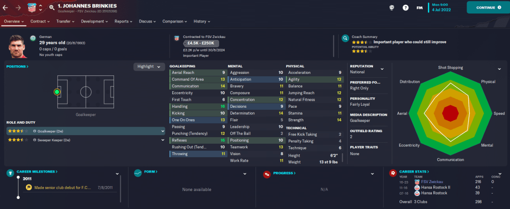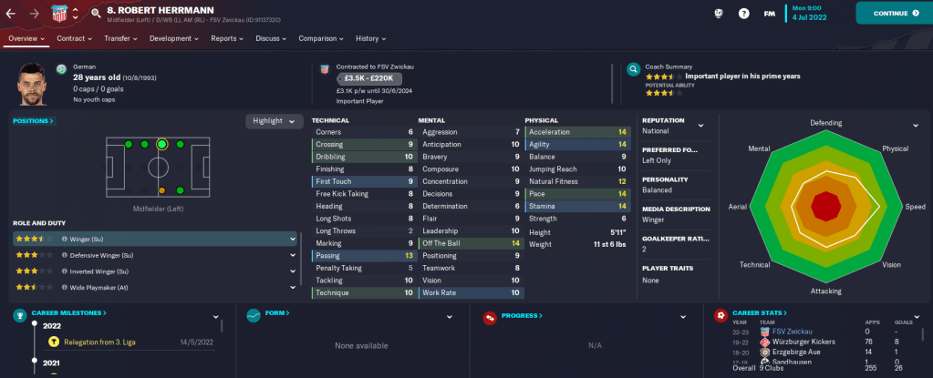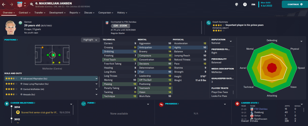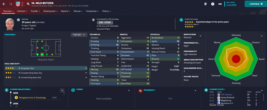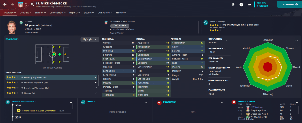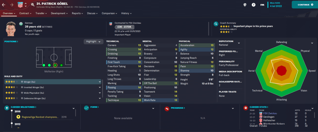 The best player at FSV Zwickau, according to Prusseit’s coaching team, is versatile right-back Nils Butzen, who looks a decent player but lacks a little pace. He’s the only 4-star ability player followed by seven 3.5-star players in another right-back Patrick Göbel, centre-backs Robin Ziegele and Davy Frick, left midfielder Robert Herrmann, goalkeeper Johannes Brinkies, and midfielders Maximilian Jansen and Mike Könnecke, who has the world’s bluest eyes! A lack of strikers was evident, as Prusseit’s goals were reliant on Dominic Baumann and 39-year-old Ronny König, who still has solid physicals but is unlikely to be prolific.
