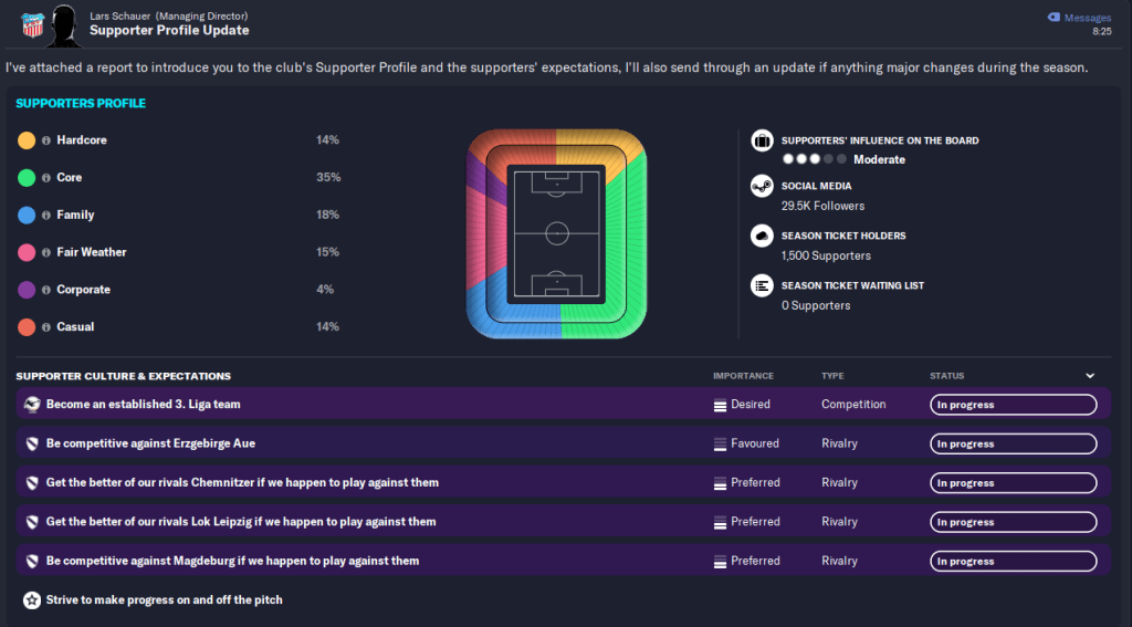 Zwickau’s fanbase of 1,500 supporters consists of 14% hardcore fanatics and 35% core fans, with just 14% casuals and 18% family-supported. It has 29,500 followers on social media, no fans on the season ticket waiting list and a moderate influence on the club’s board. The fans expect Zwickau to be competitive with fellow third-tier side Erzebirge Aue and better other rivals Chemnitzer, Lok Leipzig and Magdeburg. They also expect consolidation as an established 3. Liga team.