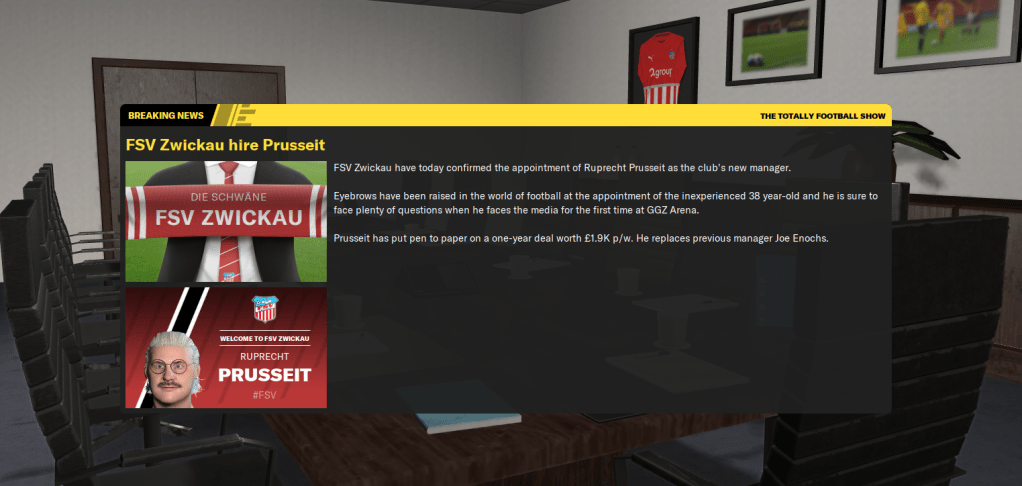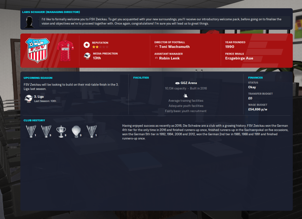 The next morning, Prusseit – who had never even considered taking coaching badges and of course only had Sunday Football experience – drove the 78 miles over to Zwickau. He was greeted by a huge welcoming party of Schauer and his Director team of Matthias Krauss, Lutz Teichmann, Ingo Kursawe, Frank Fischer, Wolfgang Elsel, Ilja Poser, Peter Rogsch, Stefan Hersh and Marco Holzel, as well as Director of Football Jerome Konig. And the bizarre dream was very much a reality – Prusseit was officially a Football Manager!