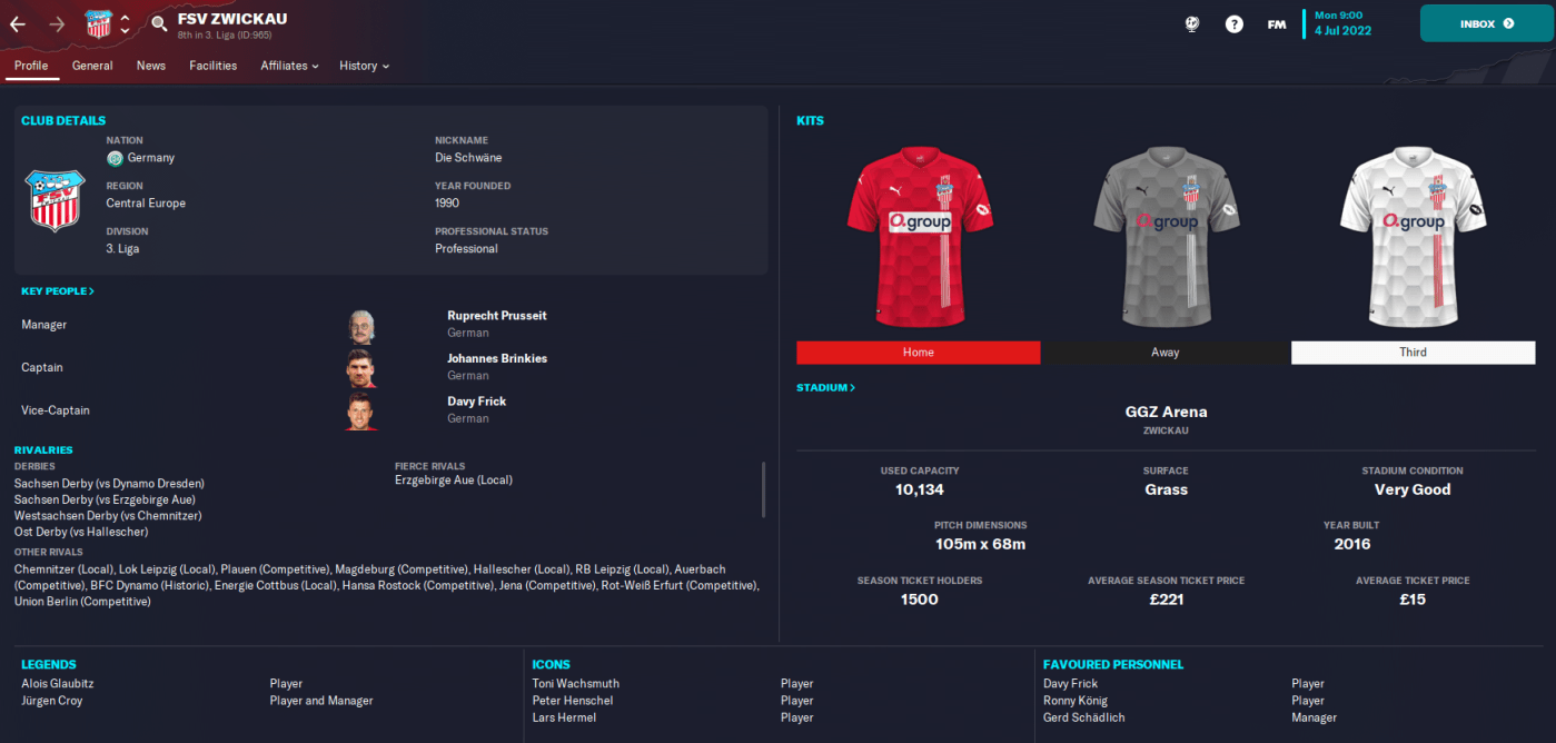 Zwickau play at the 10,134-capacity GGZ Arena, which was built in 2016. Its home kit is predominantly red with white flashes, alongside a grey away kit and white third kit. The club has four derby clashes, including two Sachsen Derbies with Dynamo Dresden and Erzebirge, as well as the Westsachsen Derby with Chemnitzer and Ost Derby with Hallescher. Erzebirge are the only fierce rival alongside a mass of other rivalries.