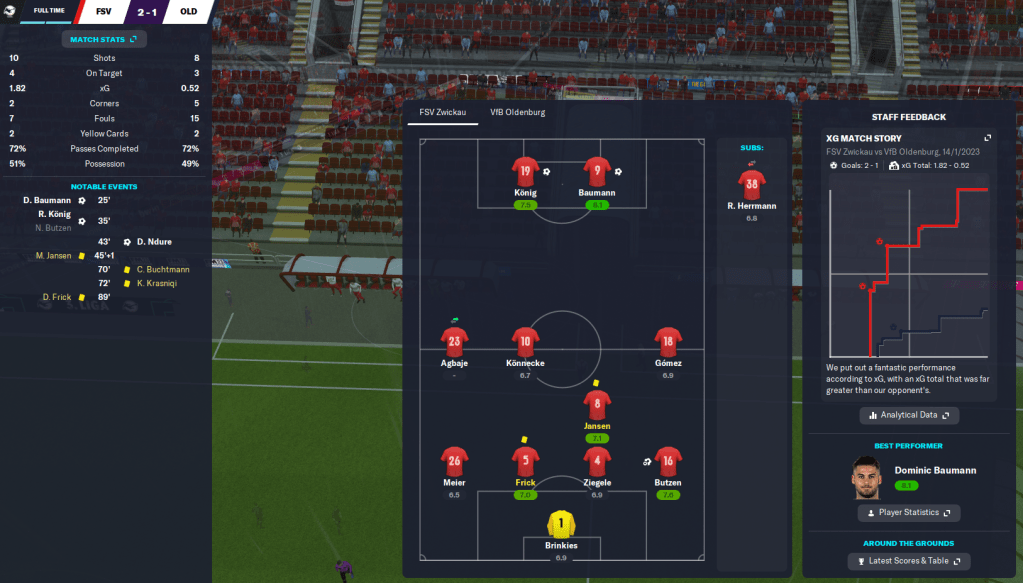 Game 3 – Oldenburg (18th, away): The perfect pick-me-up opportunity was a trip to relegated Oldenburg. Target forward Baumann was passed fit after two months out and made an immediate impact as his shot was parried for Eichinger to open the scoring. Eichinger doubled his tally just after the break and König replaced Baumann to head home a late third.