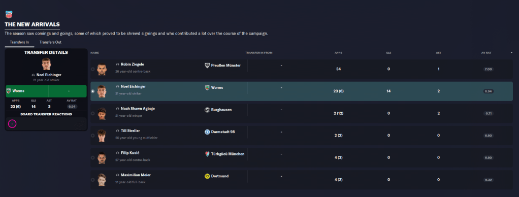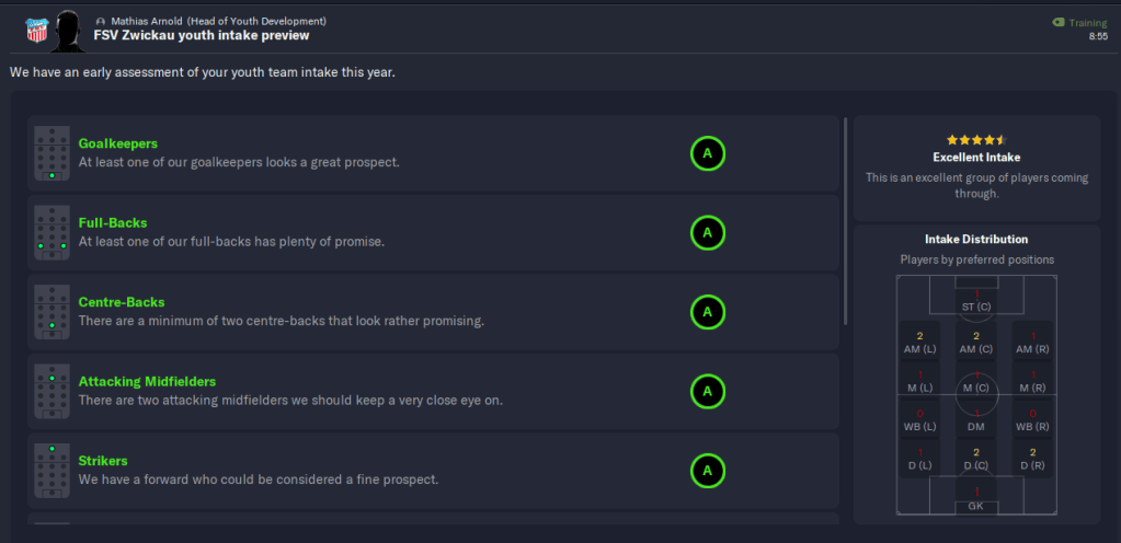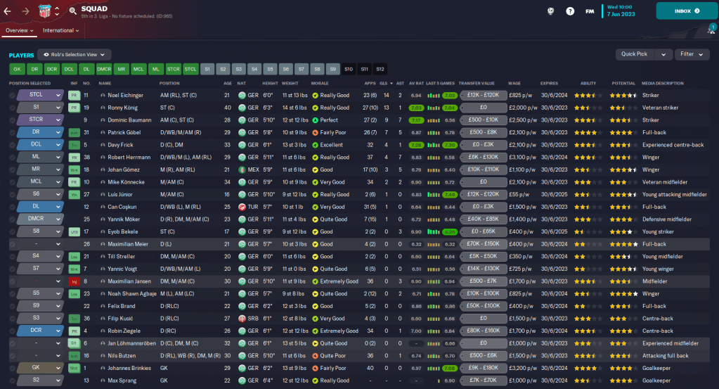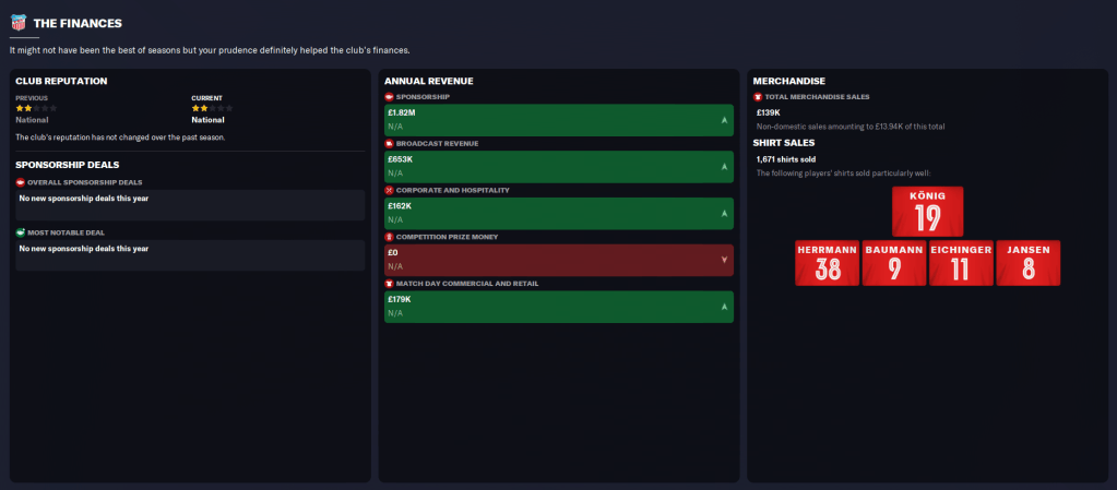 Another positive was the youth intake, which delivered on its promise with four players with 4.5- or 5-star potential and four with 4-star potential. The pick of them is goalkeeper Feisal Ali, along with midfielder Luís Júnior (who actually started the save at the club), centre-back David Bangura and winger Torben Dierschke.