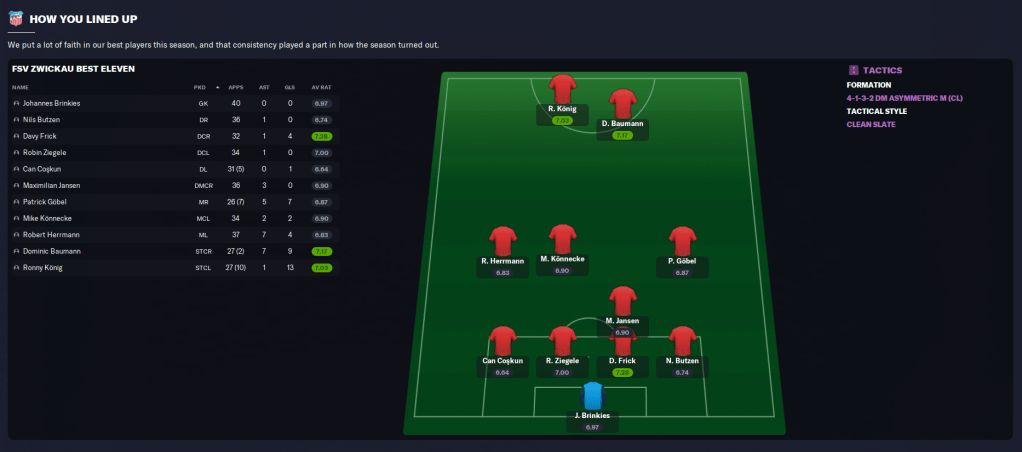 This was a superb first season in football for Prusseit, who led Zwickau to the verge of promotion without making a single signing. The star man this season has probably been centre-back Frick, who had the club’s highest average rating of 7.28 in 32 games and completed the most passes per 90 minutes (50). That won him fans’ player of the season but also the surprising honour of 3. Liga player of the season!