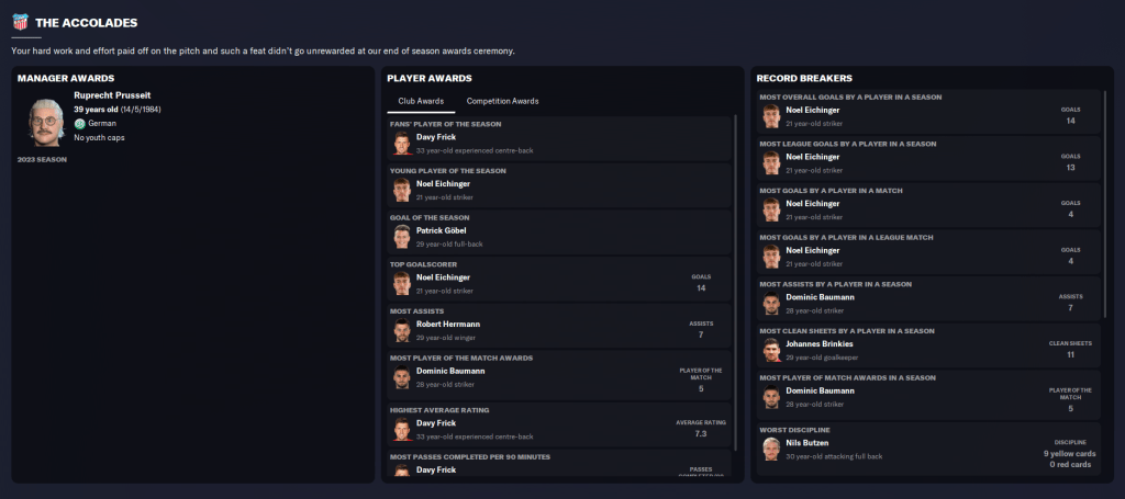 Eichinger led the way with 14 goals from 29 games, four of which were in one match, and won fans’ young player of the season. König scored 13 in 37, which isn’t bad for a 39-year-old, followed by Baumann (9), Göbel (7) and Frick and Herrmann (4). Baumann and Herrmann topped the assists with seven followed by Göbel and Gomez (5). While Frick, Baumann and König managed an average rating over 7.