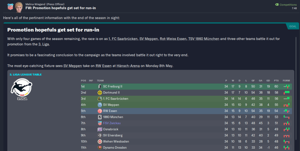 Going into the final four games, any of the top 11 could feasibly nick promotion! B teams (i.e. the top two, Freiburg and Dortmund) can’t be promoted from this division, which technically means Saarbrucken lead the way on 56 points.