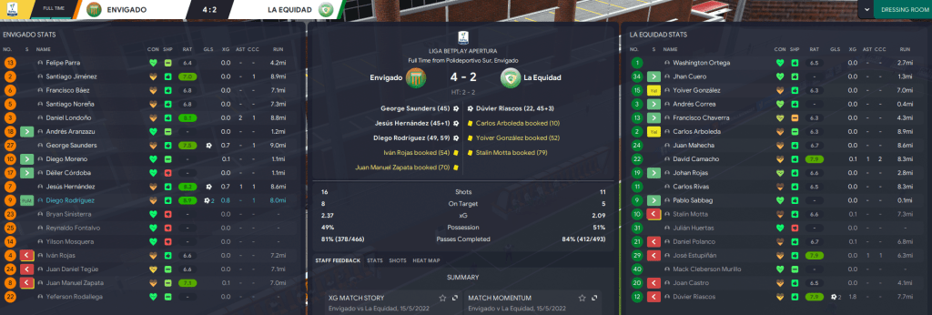 That lifted Envigado into the top eight heading into the final game of the Apertura stage, so a point at home to mid-table La Equidad would send them into the post-season semis. The visitors obviously scored their first shot, Envigado responded through two goals in a minute before the break from Saunders and Jesús Hernández then somehow managed to concede immediately. Rodríguez restored the lead just after half-time and swiftly doubled his tally to secure a huge victory.
