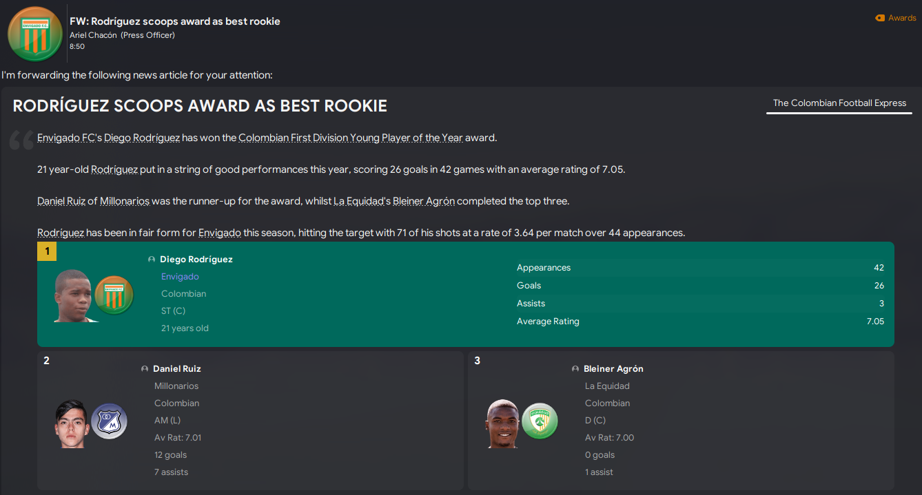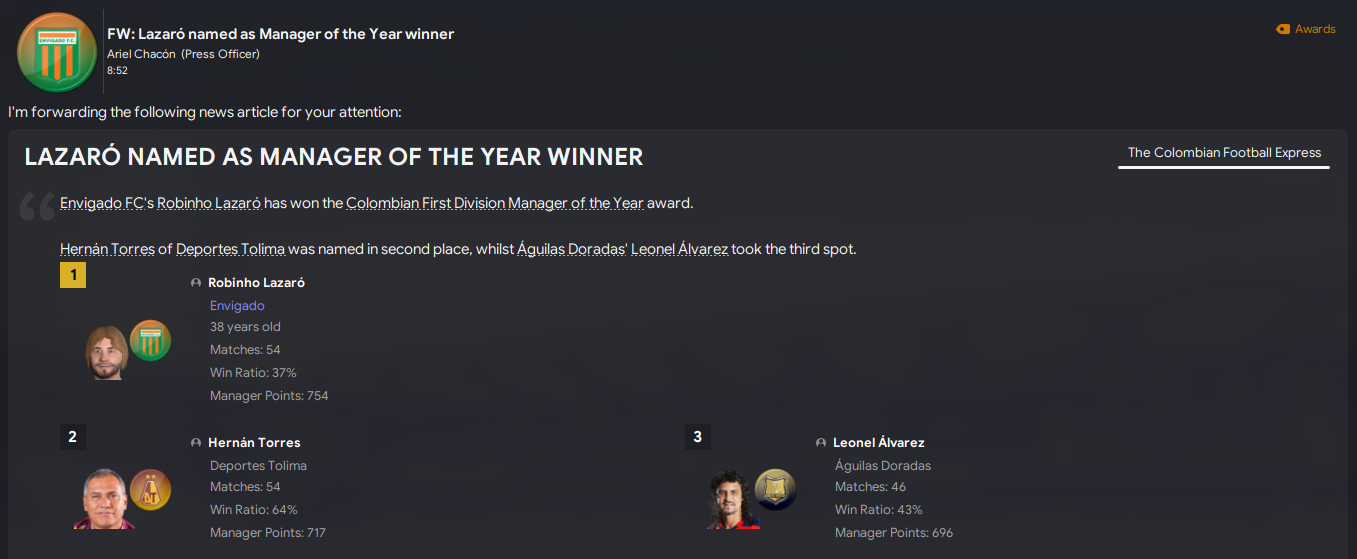 Lazaró was pretty happy with his first season in charge, claiming Manager of the Year and performing well beyond all expectations. As a result, he was already ticking off board objectives, establishing the club as a top-tier side and developing the best youth system in Colombia four years ahead of schedule after the board agreed to his request for new youth facilities.