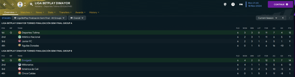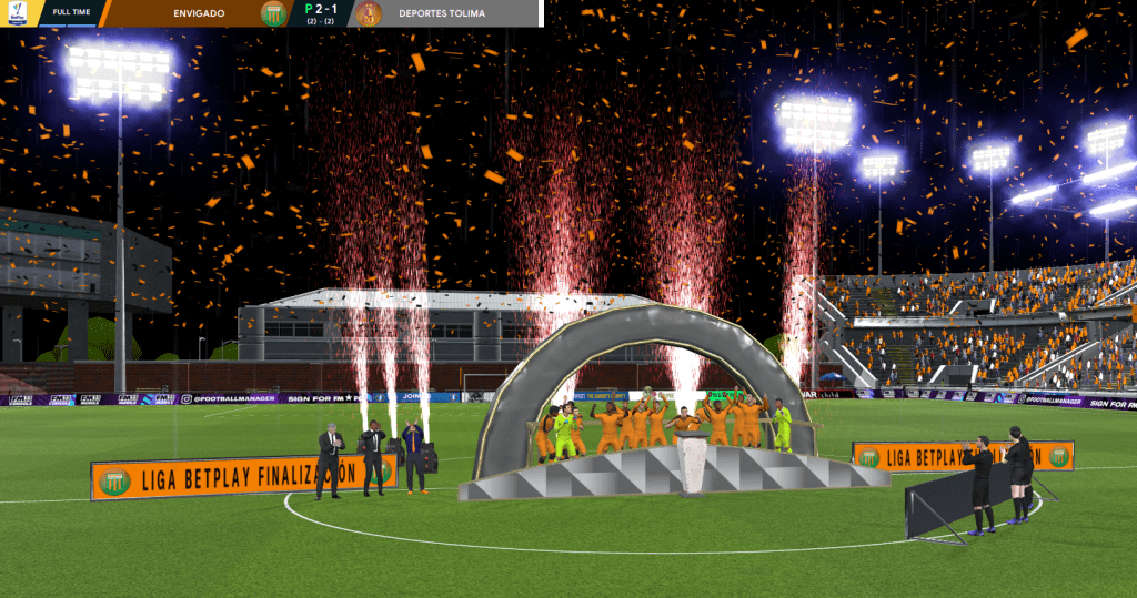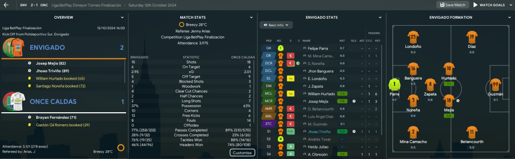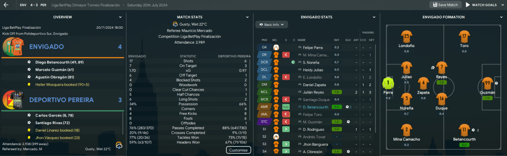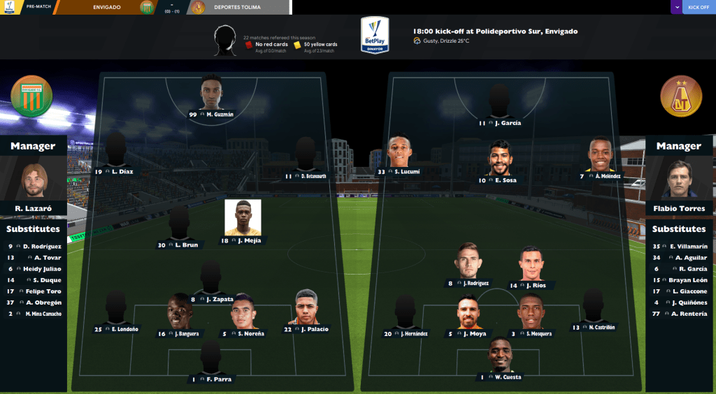 Lazaró massively rotated for the trip to Once Caldas and Lorenzo Brun’s first career goal rescued a 1-1 in injury time, then they beat them 2-0 away a few days later with first-half goals by Guzmán and centre-back Jhon Banguera. That left Envigado one point clear at the top of the group going into the final game at home to América – which, incidentally, was Lazaró’s team in his Aventuras Américas FM22 journey. And they delivered a 3-0 success with a penalty bizarrely taken by right-back Julián Palacio for his first-ever Envigado goal then Santiago Norena and Mejía strikes. That sealed the group win and a place in the Final for the second time this season but, annoyingly, they would yet again take on bogey team Tolima, who they’ve now beaten once in 16 meetings.