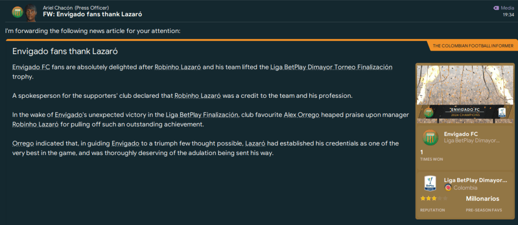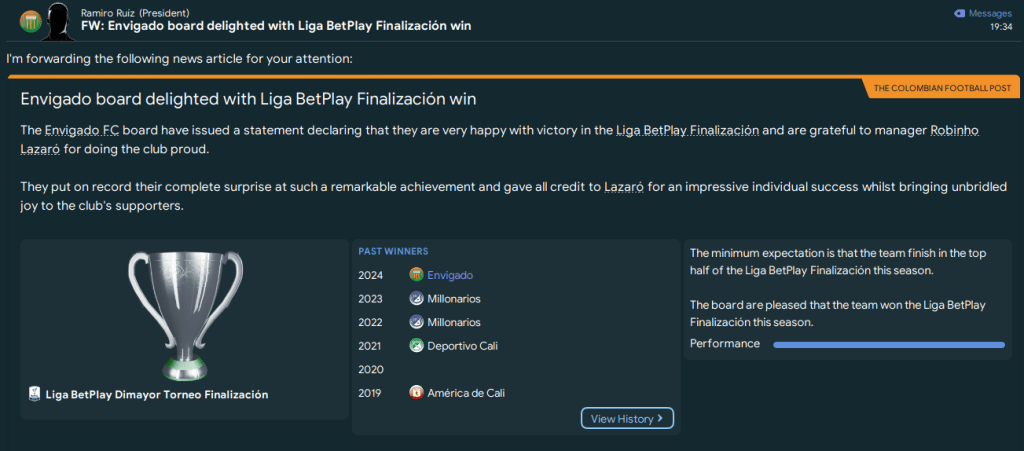 For some reason, FM23 doesn’t give us the nice season review feature at the end of the Colombian campaign, which is a bit annoying. Nevertheless, this season’s star man is a toss-up between three players. Rodríguez scored a club-record 31 in 46 but missed plenty of games through injury. That saw Guzmán step up in his place, scoring 23 goals in 41 games, of which 30 were starts, and winning top goalscorer in the Finalización stage with 17 in 17. That’s impressive for a 17-year-old and he’s now considered a better striker than Rodríguez!