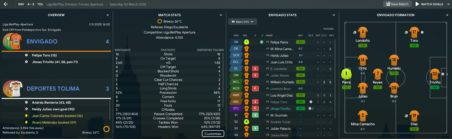 Envigado’s first chance to celebrate their maiden title at Polideportivo Sur came against Pasto. And they did so in style with a 3-1 win, which Zapata started with an early strike before Guzmán and Mejía wrapped up all three points. But they hit new levels at Bogotá as, despite going 1-0 down after 30 seconds, Guzmán bagged a hat-trick and Betancourth scored two and made another in a 7-2 away victory.