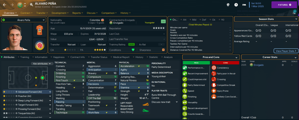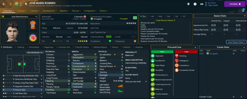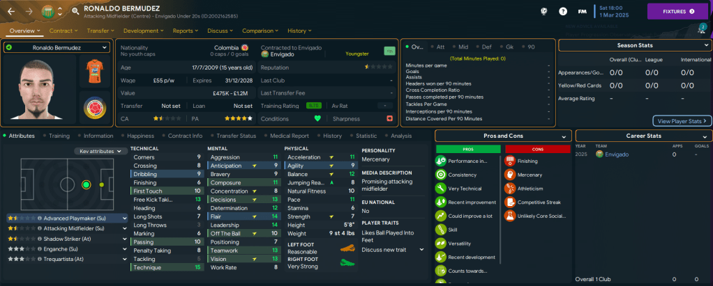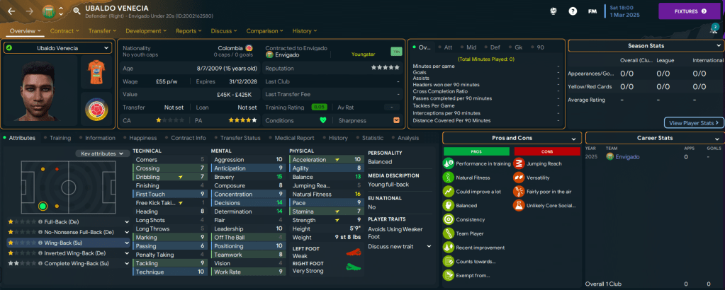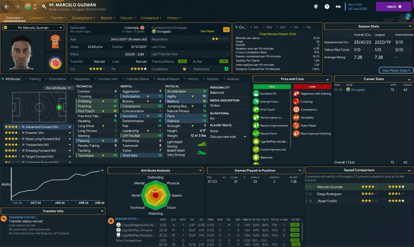 That doesn’t include the mass of talent in the under-20s squad, which was added to by a third stellar youth intake. The pick of this intake was attacking midfielder Ronaldo Bermudez, along with three further 5-star potential talents in striker Álvaro Pena, midfielder José María Romero and right-back Ubaldo Venecia. As a result, the youth team now has 23 players with at least 4.5-star potential and 14 of those have 5-star potential!