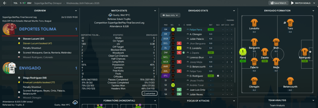 Lazaró had to rotate for the return leg but they did well to hold Tolima to another 1-1 draw, largely thanks to 12 saves from Felipe Parra! So, for the second time in a few months, the two teams went to penalties. And again it was Envigado who held their nerve with Parra the fitting hero with two penalty saves.