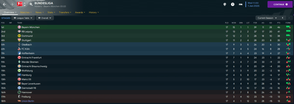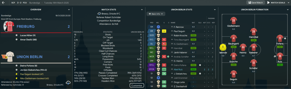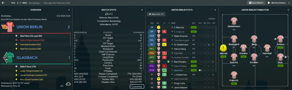The first game without him saw his teammates score twice, including Fofana’s first for the club, but annoyingly their opponents Stuttgart scored 4. They then lost 2-1 at Leverkusen to an Adam Hlozek brace, which plunged Union back to the bottom of the league. Big Sam slightly tweaked his tactic to move to a diamond, which worked nicely as they were slightly lucky to defeat 5th-place Gladbach 2-1 thanks to a Ruiz double. But that was quickly forgotten with a 5-0 thumping at Dortmund.