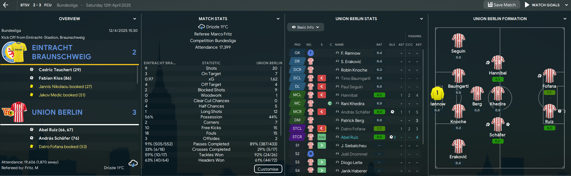 That lifted Union to 14th above their next opponents Eintracht Braunschweig, who’d lost 6 on the bounce. And Union made it 7 thanks to 3 goals in 10 second-half minutes. Braunschweig led but Ruiz scored 2 in 2 minutes then a Schafer strike inspired a comeback and 3-2 success. That lifted Union to 13th and 6 points of 16th-place Darmstadt, so it was still far from over.