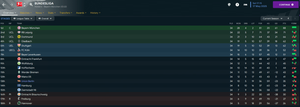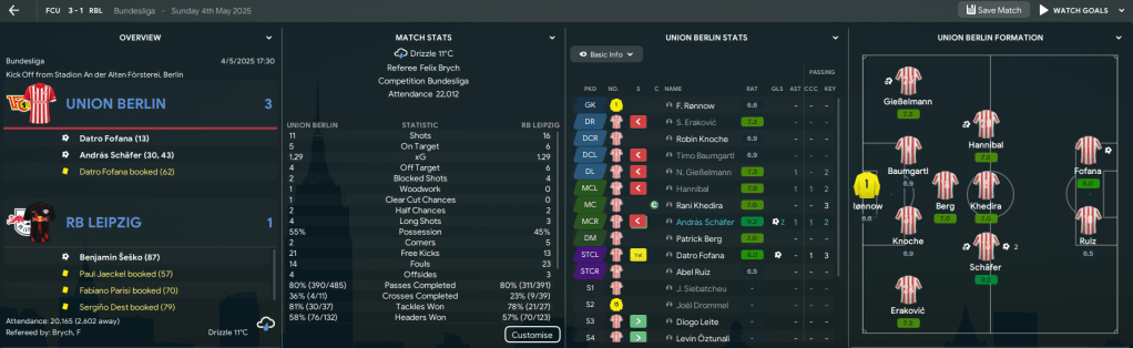 First up was 6th-place Koln, who scored inside 5 minutes. But Fofana responded 6 minutes later and Union had the best of the game but couldn’t find a winner. Darmstadt lost 2-1 to Bayern, so Union edged 7 points clear of them. They lost 2-0 at Mainz then somehow beat 2nd-place Leipzig 3-1 led by Fofana’s opener and a Schafer brace. And that result officially kept Union Berlin up, moving them 9 points clear of the drop with 2 games to go. And what a win this was!