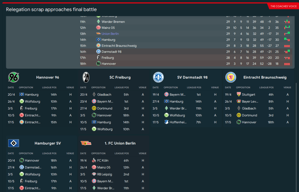 Union’s survival could swing on 4 big games in March. First up was a must-win at home to Hannover and Union delivered. They dominated by 14 shots to 3 and scored twice through strikers Fofana and Ruiz to move 5 points clear of relegation. However, Big Sam knew all too well that meant nothing with 10 games still remaining.