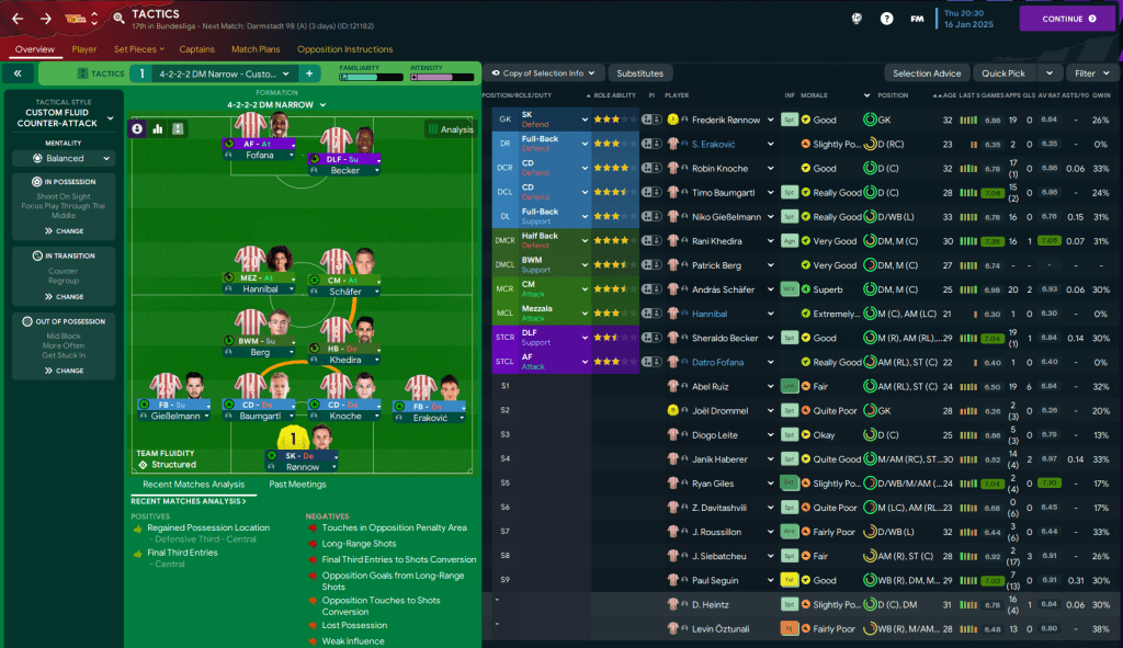 Big Sam again walked into a club that somehow had no money despite the great finances available in Bundesliga, with just £3.3m in the bank balance and £2.1m in the transfer budget. Annoyingly, they’d also loaned one of their better midfielders Morten Thorsby to Pumas and another Paul Jaeckel was off to Leipzig for a new club-record £9.5m, leaving 19 first-team players.