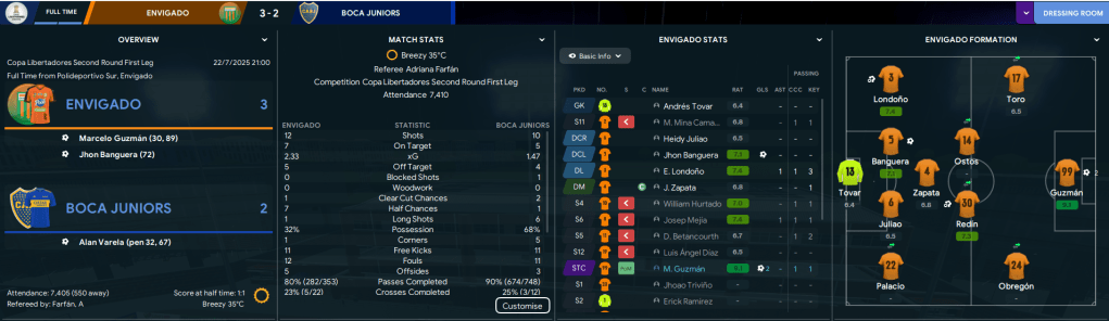 The home leg was up first and Envigado started superbly with Guzmán missing two decent chances. He made one count after half an hour, only for the ref to gift Boca a dubious penalty. Envigado continued to be much the better team but Boca moved 2-1 ahead against the run of play with a long-range strike. But an unlikely hero dragged them level as Jhon Banguera stabbed home. Lazaró made five subs and one of them delivered as Redín ran down the wing and put a second goal on a plate for Guzmán in the 89th minute. They went defensive and held on for what has to be the biggest win in club history!