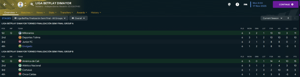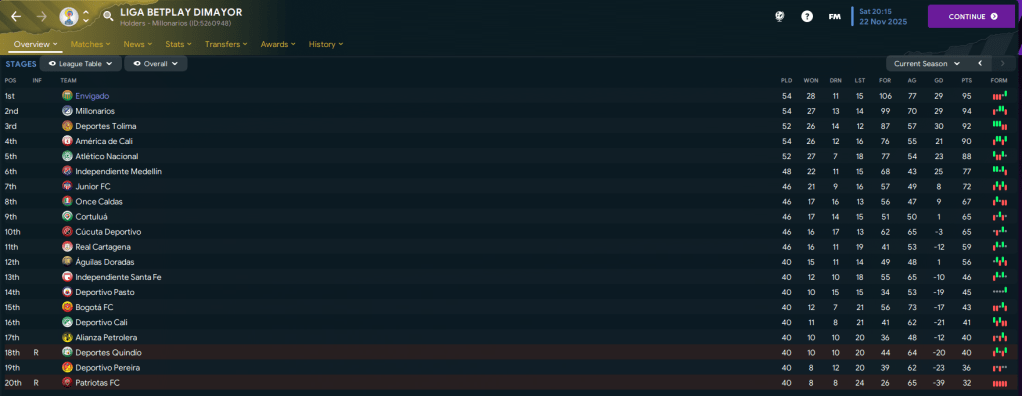 Envigado got a tough post-season group alongside Tolima, Millonarios and Junior, which wasn’t helped by several defensive injuries. They began by drawing 1-1 at home to Junior then lost 1-0 at Tolima and 2-1 at Junior, in which Guzmán scored on his comeback to equal Rodríguez’s record. He scored his record-breaking 37th of the season at Millonarios, despite the team falling to a 3-1 defeat, then extended it with the opener in a 2-2 draw at home to Millonarios, which saw Envigado set a new club record seven games without winning.