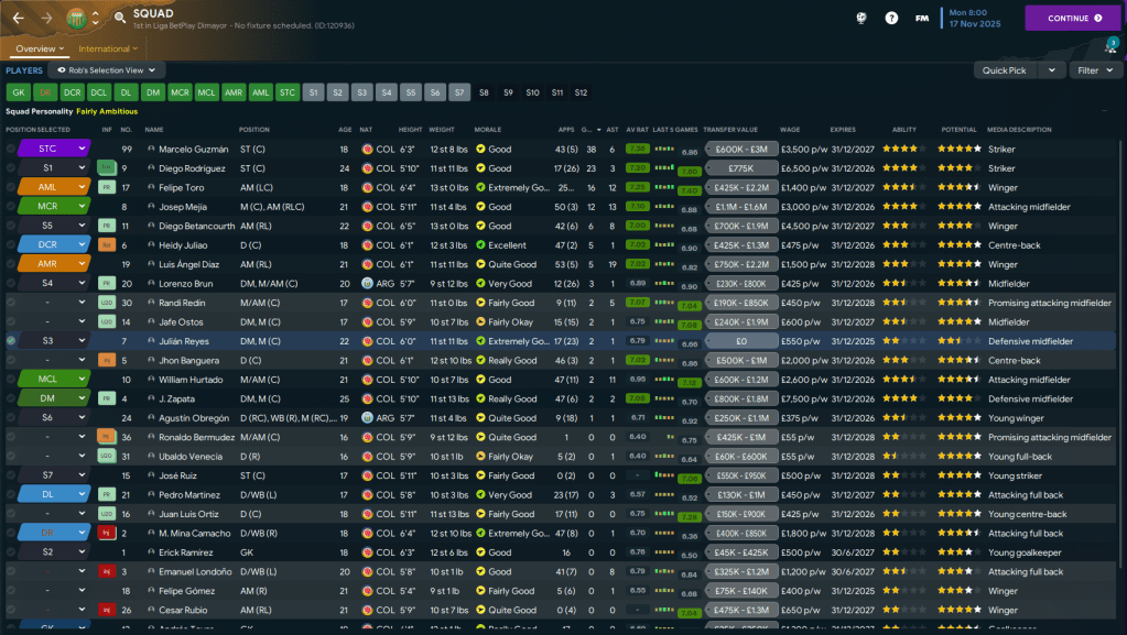 The entire first-choice 11 is now fully homegrown at Envigado with record goalscorer Diego Rodríguez and midfielders Julián Reyes, Agustín Obregón and Lorenzo Brun the only squad members who developed at different clubs.