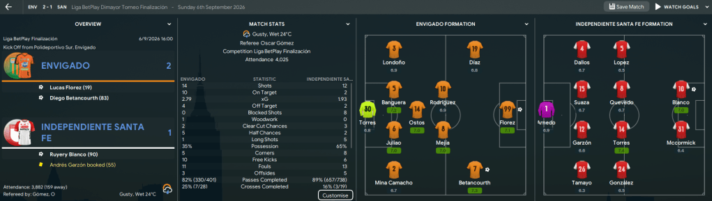 But their form never really recovered, which saw them again on the brink of the post-season in 8th place as just three points separated 5th and 9th with four games remaining. Rodríguez scored a penalty to nick a 1-0 over Petrolera and another to nick a 2-1 win at rivals Águilas Doradas. But a 4-2 defeat at home to Bogotá set up a tense final day with two points separating 5th and 9th! Envigado played out a wild 3-3 draw at América, thanks to a Florez brace, which just about wrapped up 6th place.