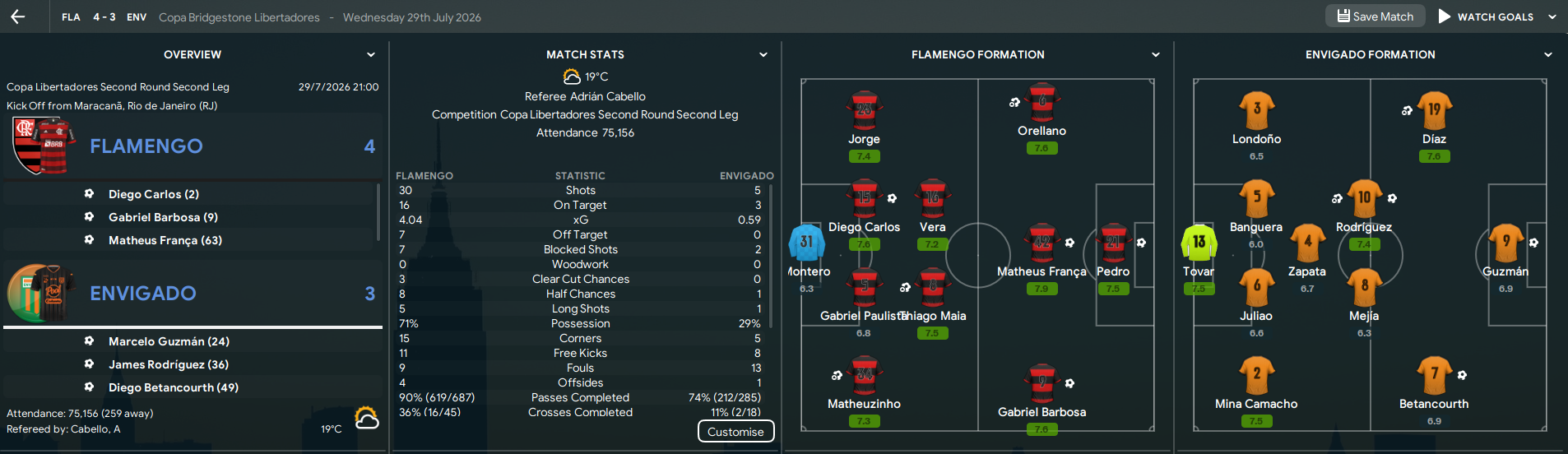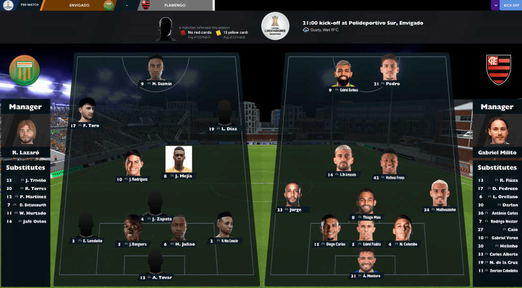 After securing qualification for the knockout stages for the third year in a row, Envigado’s history of getting a tough second-round tie continued. This time they drew Brazilian giants Flamengo, who have the likes of Gabriel Barbosa, Pedro and Fausto Vera all valued over £20m and Barbosa and Diego Carlos earning £77k a week, which is half Lazaró’s monthly wage budget! In fact, they have 20 players worth more than Envigado’s highest-valued player and 25 earning more than Envigado’s biggest wage. And just look at the state of the team they put out, which could probably beat most decent European sides!