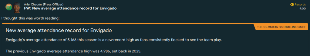In off-field developments, Envigado recorded their highest average attendance of just 5,166, which isn’t great considering they have 281,300 followers on social media. So more fans are required to pack out the 14,000 Polideportivo Sur.