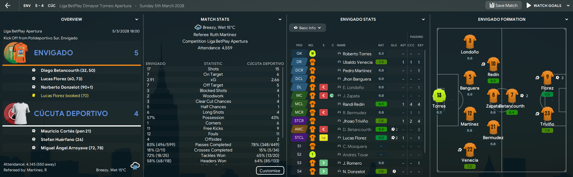 They finally picked up a win as the returning Trivino and Florez downed Magdalena 2-0. But the struggles continued as they lost 2-0 at Santander, 2-1 at home to Pasto and 3-2 at Expreso Rojo. That forced Lazaró into an early switch to his two-striker formation, which was a narrow 4-3-1-2. And it had some impact as they were on the right end of a thriller, defeating Cúcuta 5-4 led by braces from Diego Betancourth and Florez.