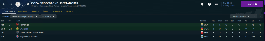 They got a good start as Betancourth scored the only goal at home to Argentinos. Lazaró’s 400th game in charge of Envigado, just like his 300th, was at Maracana as Envigado took on the impossible at Flamengo and got comfortably beaten 3-0 with Gabriel Barbosa scoring twice. They also lost 1-0 in Peru but a Trivino double earned a vital 2-0 win at home to César Vallejo, which left the two teams level on six points with two games remaining.