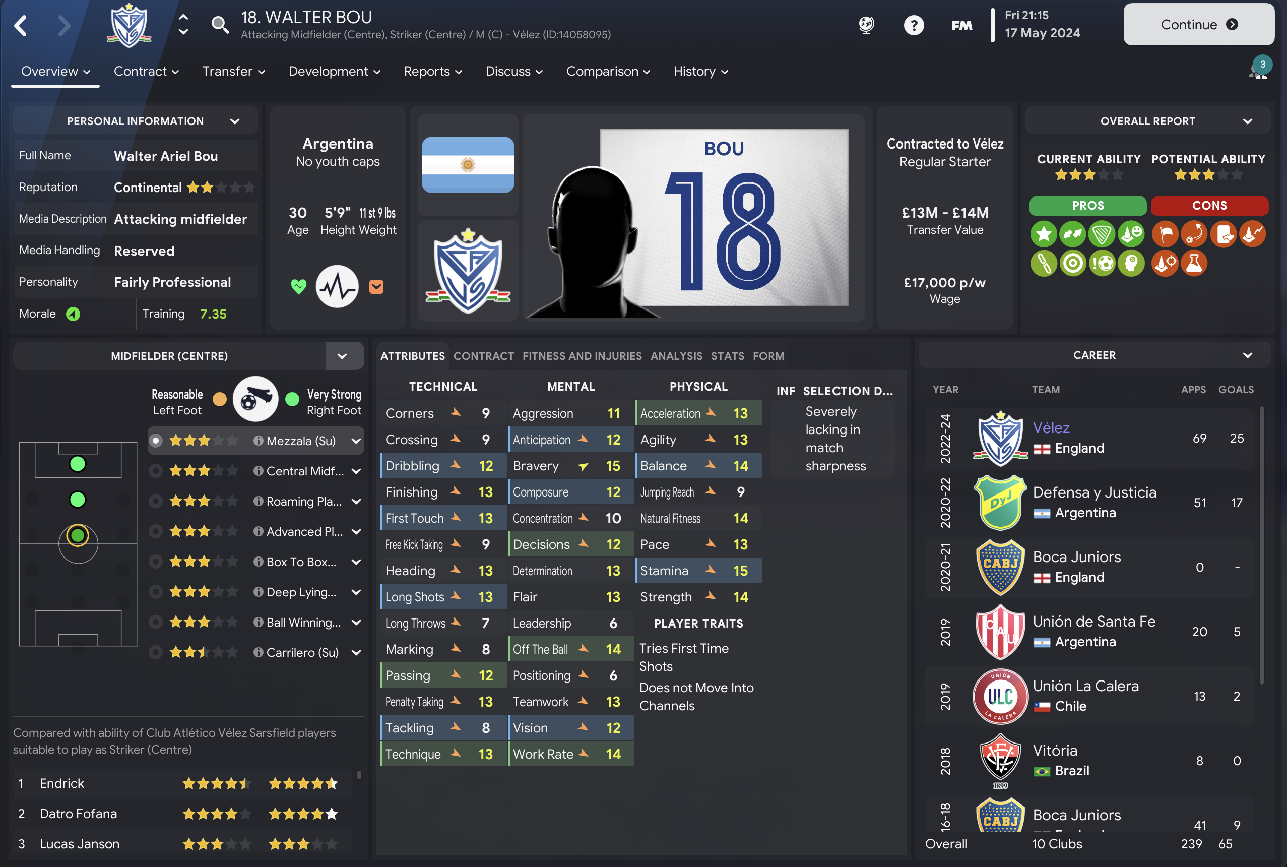 We got offers from the likes of Fluminense and Palmeiras over the summer, but turned them down as they were either in a more diffiuclt division at the same level or at a higher level. And the Velez board rewarded that faith with a new 3-year deal on £11.5k a week.
