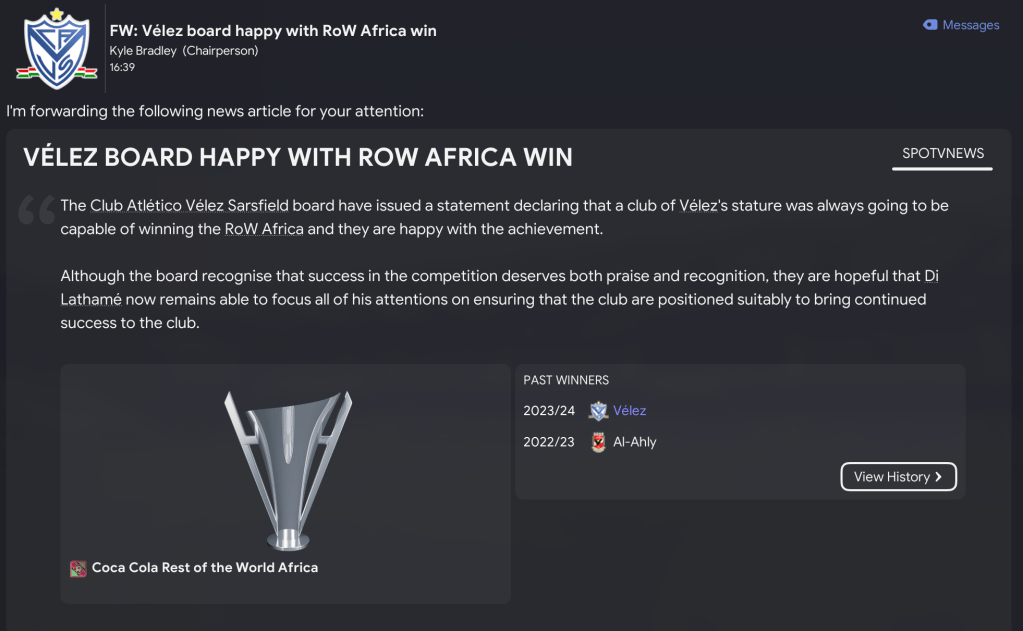 Endrick became the youngest-ever goalscorer in the RoW Trophy cup competition as Velez eased past Wellington Phoenix in the first round, which earned them a cool £5m. We eased past Rapid Wien 7-4 on aggregate and Rayo Vallecano 6-3 on aggregate but lost to Fluminense in the quarter-final.
