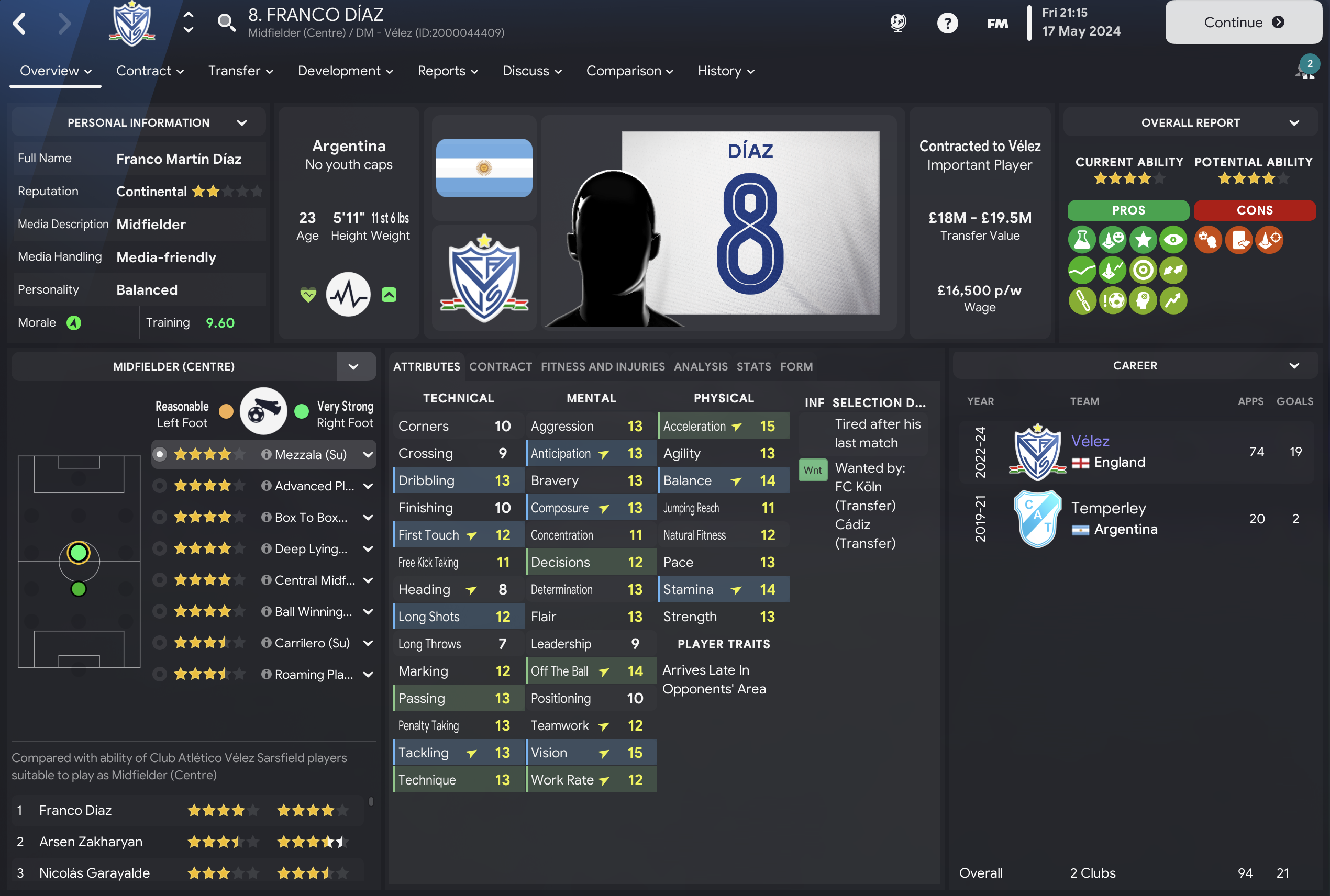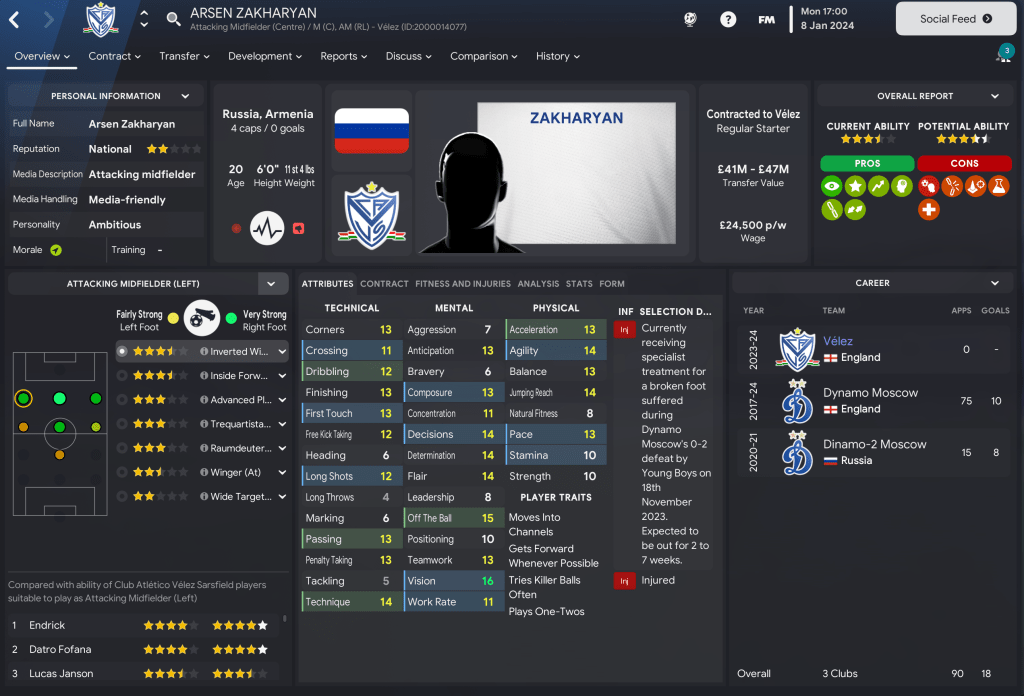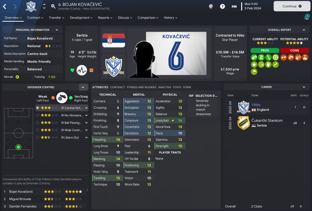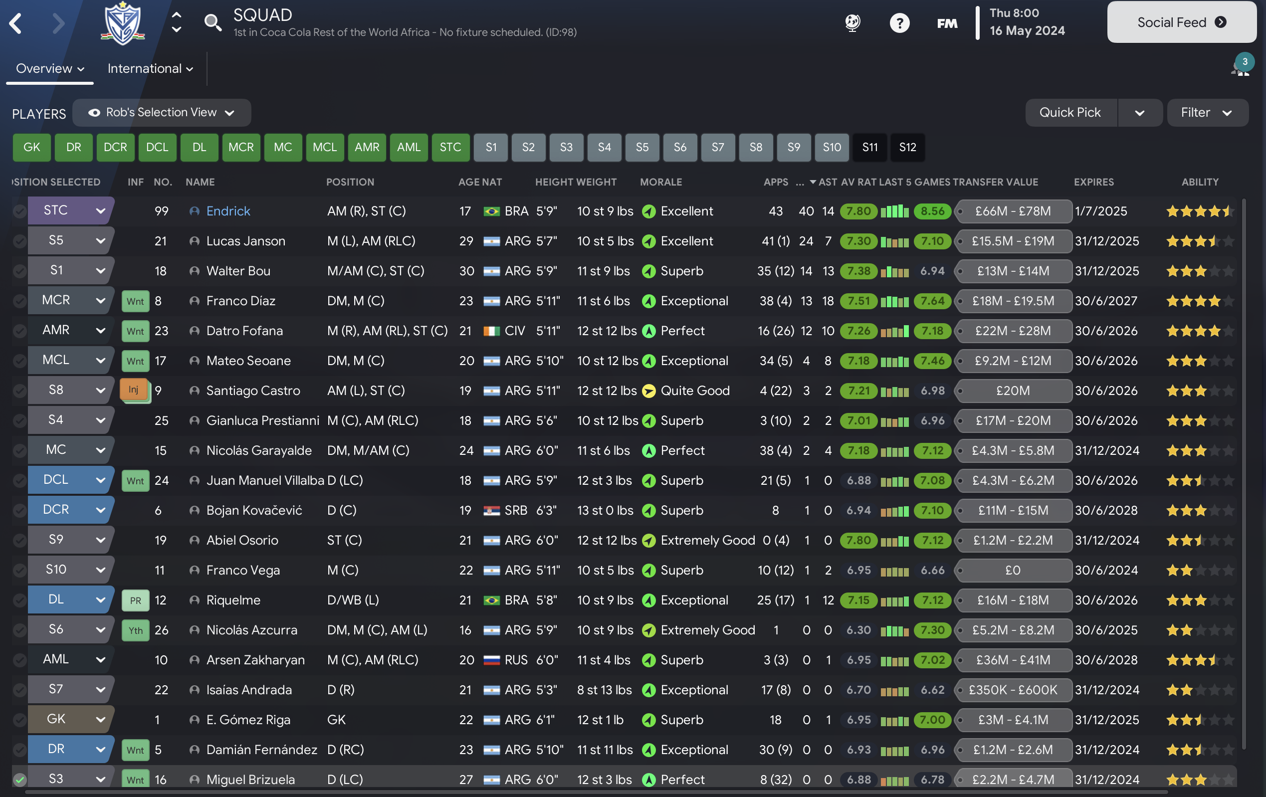 The board handed us more transfer budget in January and I splurged £21m of it on attacking midfielder Arsen Zakharyan, which was another new club record transfer. That was swiftly followed by a new club record sale as centre-back Valentin Gomez moved to ES Tunis for a huge £34.5m. We tried to invest that into signing Endrick permanently for mega-money, but he decided he wanted to stay at Palmeiras. However, we already had a ready-made replacement for Gomez in Bojan Kovacevic, who cost £7m, and promising homegrown 17-year-old Juan Manuel Villalba.