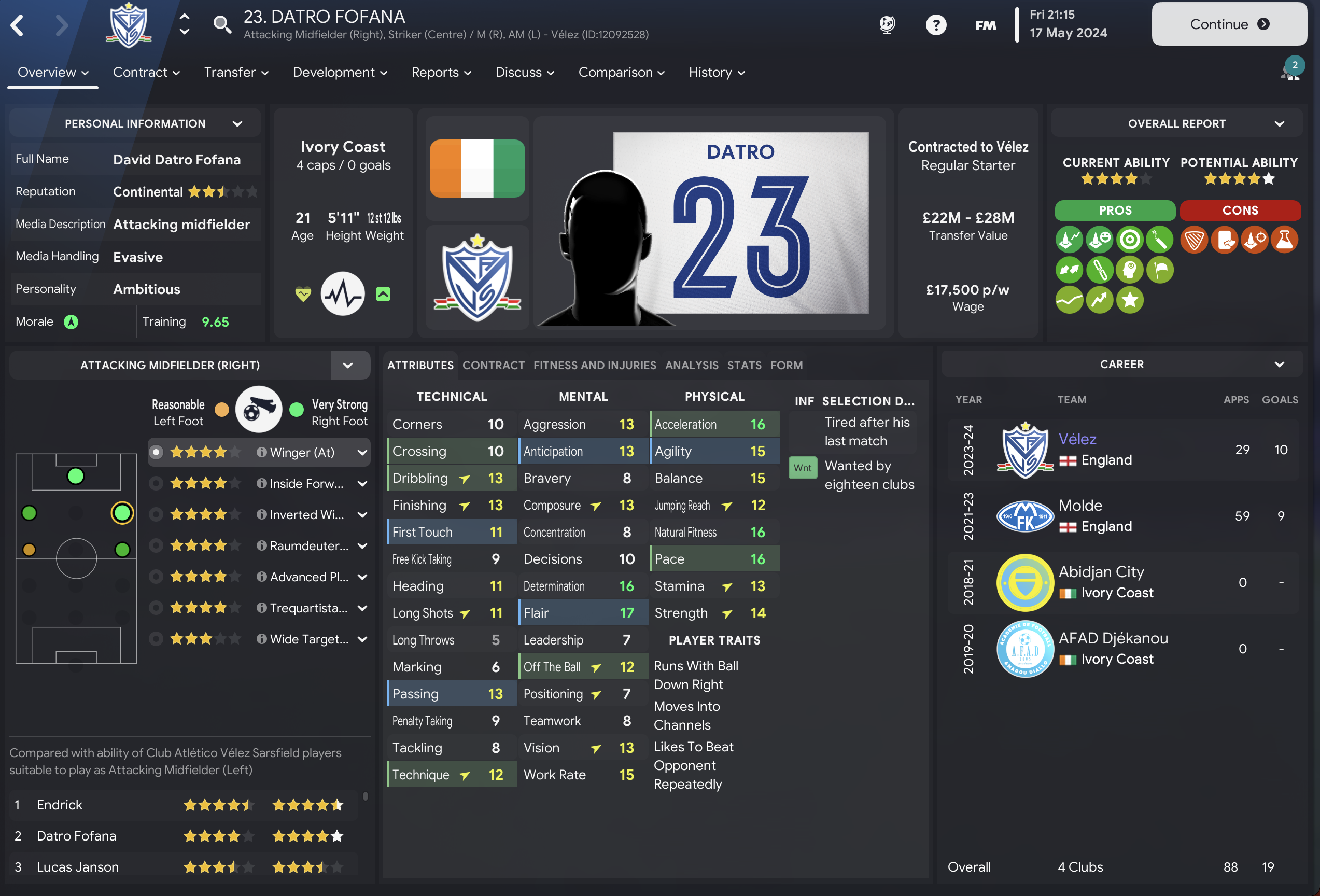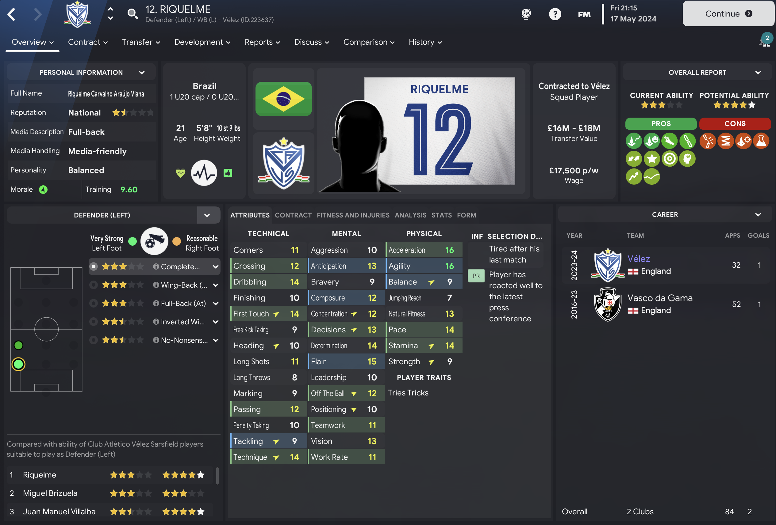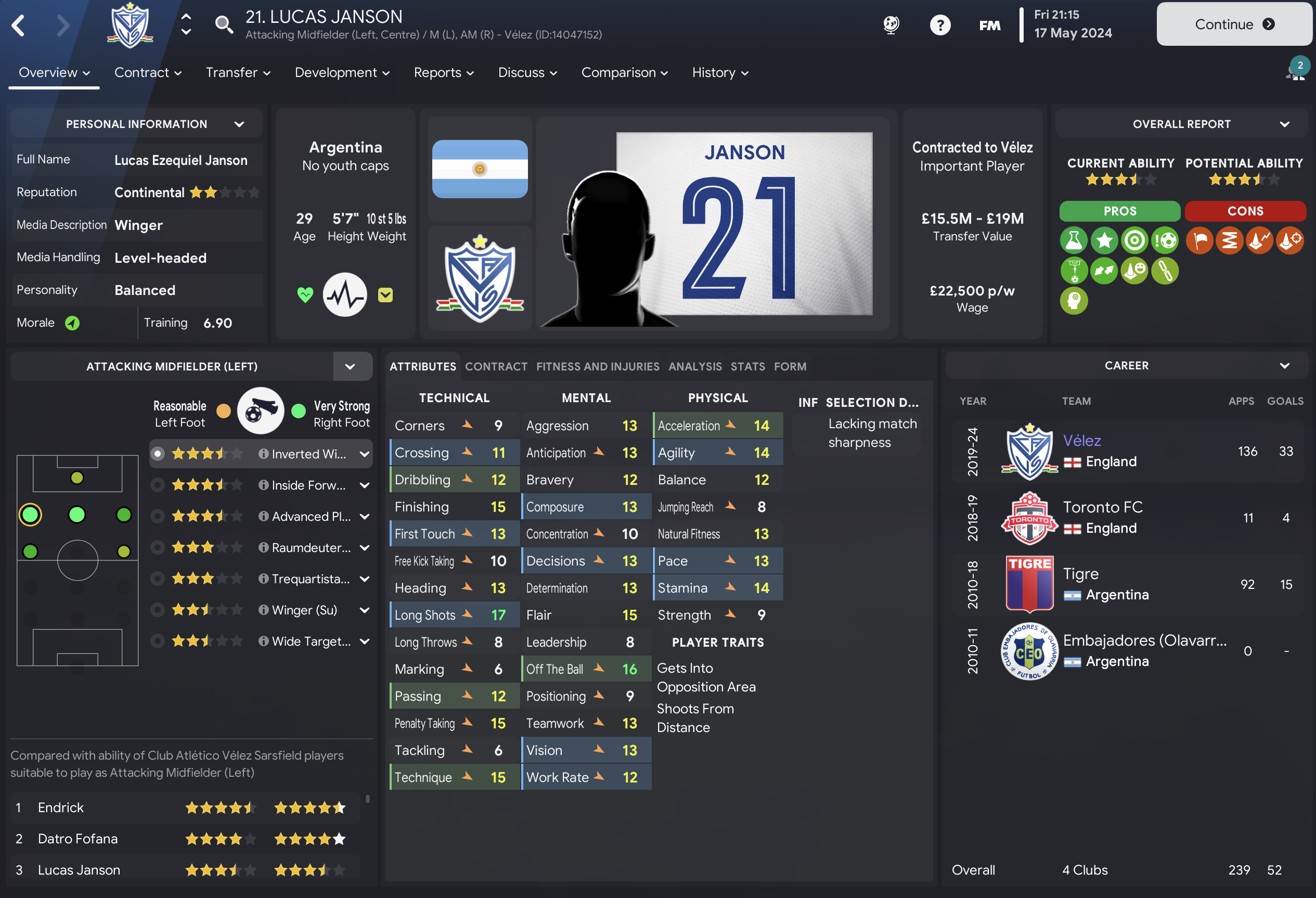 The board handed us more transfer budget in January and I splurged £21m of it on attacking midfielder Arsen Zakharyan, which was another new club record transfer. That was swiftly followed by a new club record sale as centre-back Valentin Gomez moved to ES Tunis for a huge £34.5m. We tried to invest that into signing Endrick permanently for mega-money, but he decided he wanted to stay at Palmeiras. However, we already had a ready-made replacement for Gomez in Bojan Kovacevic, who cost £7m, and promising homegrown 17-year-old Juan Manuel Villalba.