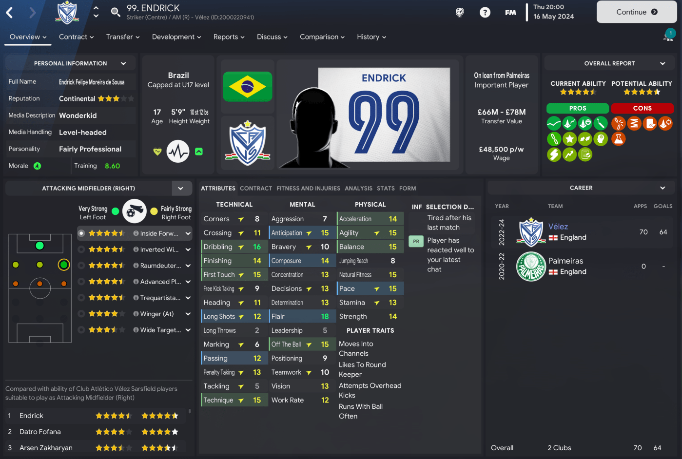The board handed us more transfer budget in January and I splurged £21m of it on attacking midfielder Arsen Zakharyan, which was another new club record transfer. That was swiftly followed by a new club record sale as centre-back Valentin Gomez moved to ES Tunis for a huge £34.5m. We tried to invest that into signing Endrick permanently for mega-money, but he decided he wanted to stay at Palmeiras. However, we already had a ready-made replacement for Gomez in Bojan Kovacevic, who cost £7m, and promising homegrown 17-year-old Juan Manuel Villalba.