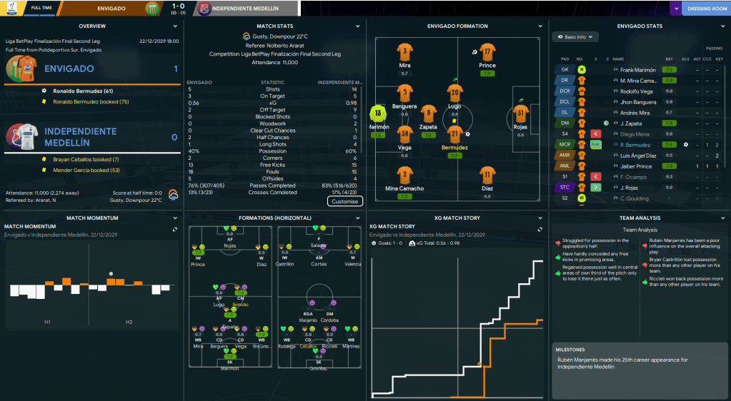 Envigdo’s continued impressive form took them into a first league phase final for three-and-a-half years, since they won Apertura in 2026. They now faced a Finalización Final against local rivals Independiente Medellín and, unusually, there was a nine-day gap between the end of the season and the first leg then a week to the second leg.