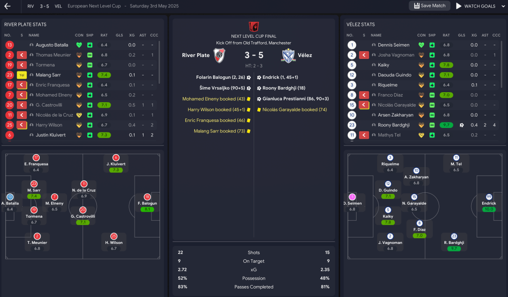 So after three defeats and 9 goals conceded against River, they were the opponents in the Final at Old Trafford. But this time we came out on top in an absolute thriller led by the absolutely sublime Endrick. The striker scored inside 40 seconds only for River to go down the other and equalise then Roony made it 2-1 before Balogun got his second to equalise. But Endrick added his second just before the break then two late goals from Gianluca Prestianni sealed a 5-3 victory. We earned £50m for playing in the Final and an outrageous £170m for winning it!!