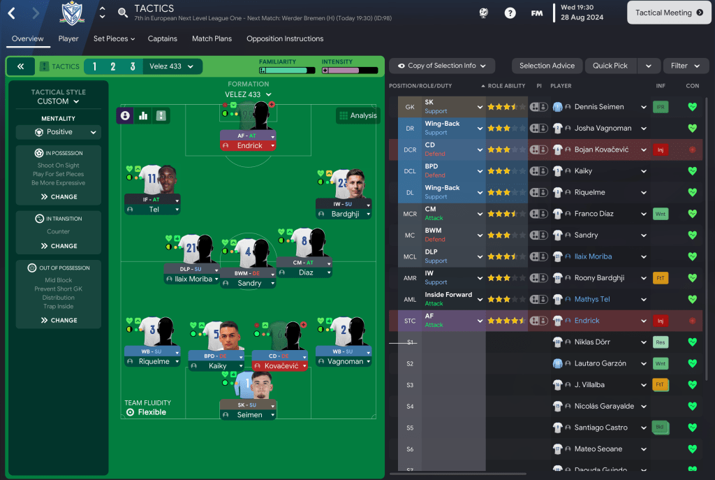 We changed up the formation at the end of last season, enabling a little more width and giving Endrick some more space up top. The 433 looks like this, with new boys Seimen, Vagnoman, Kaiky, Moriba, Roony and Tel coming in as starters.