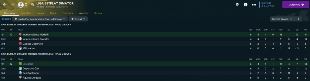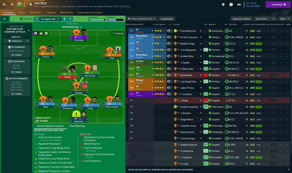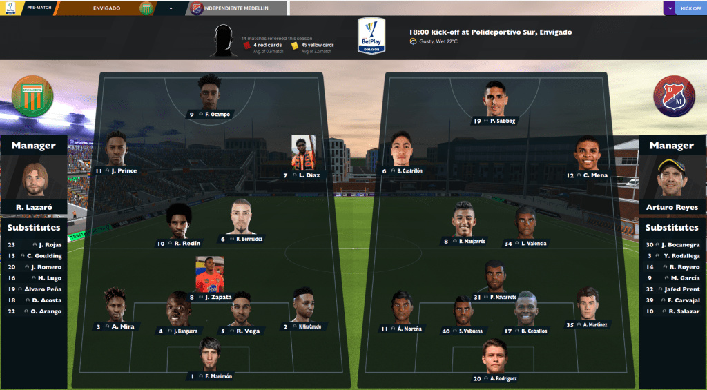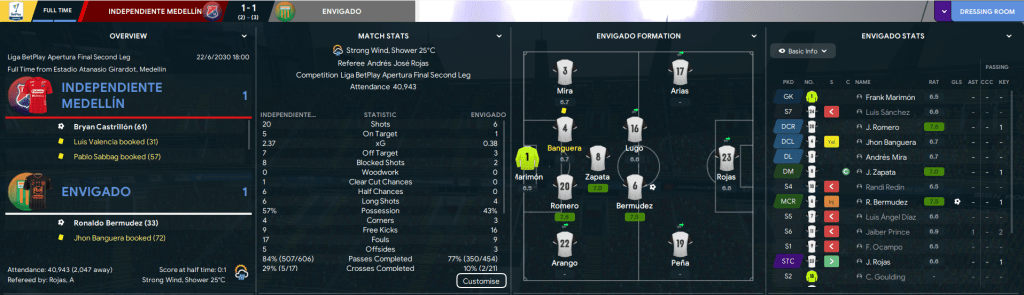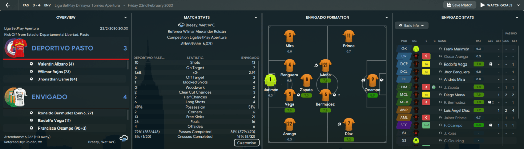 The 2030s kicked off with Envigado hosting Real Santander and dominating but only gaining a point. Their first away game took them to Cortuluá and they again earned a point as another promising striker 17-year-old Mateo Acevedo scored his first senior goal. And they made it four draws from four as Bermudez earned a point at home to Nacional then a 0-0 at Santa Fe. Bermudez had begun the season in flying form, as proven by scoring in a 3-0 win over Tolima then a brace in a 4-3 win at Pasto.