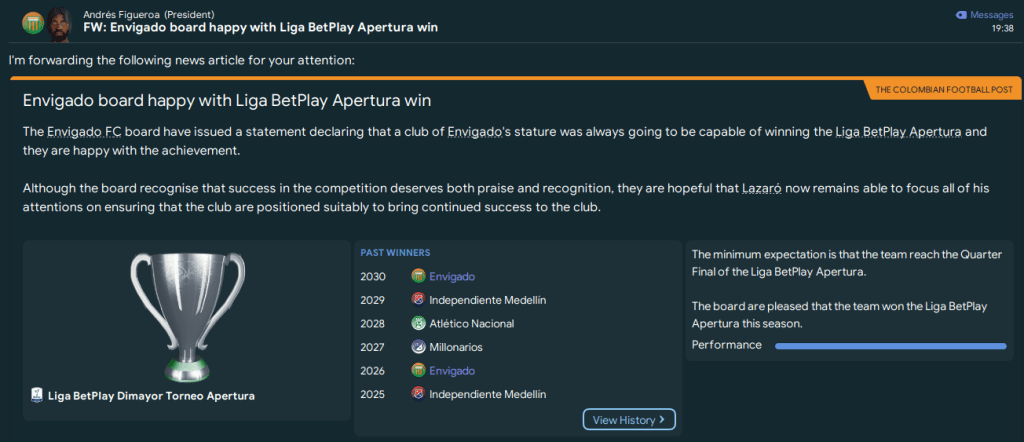 A run of easier games began by easing past Petrolera 2-1, before winger Jonathan Arias scored his first senior goal in a 3-0 win at newly-promoted Orsomarso and swiftly added a second with the winner at struggling América. While Tolima were down in 18th and Envigado claimed a vital 3-2 win led by a Luis Ángel Díaz brace, which lifted them all the way up to 4th.