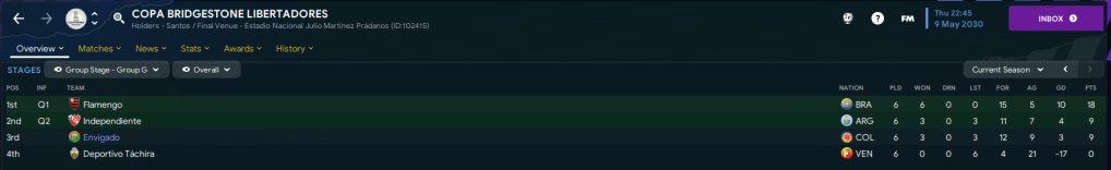 Envigado led Independiente by three points and a goal difference of five. So they needed to avoid a drubbing at Flamengo, who’d won all five games, and hope for some unlikely help from Táchira. Lazaró took a defensive approach but they still lost 4-0 while Independiente won 2-0, which saw Envigado miss out on qualification by one goal! But the positive of that was they qualified for Copa Sudamericana knockouts.