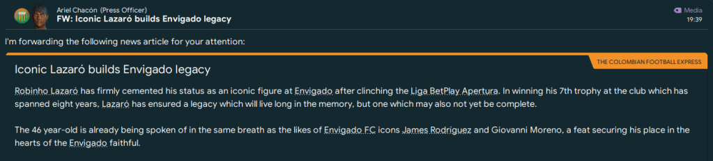 That success saw Lazaró wrap up his fourth league title and seventh trophy in charge of Envigado, which was enough for the fans to instill him as an iconic figure at the club.